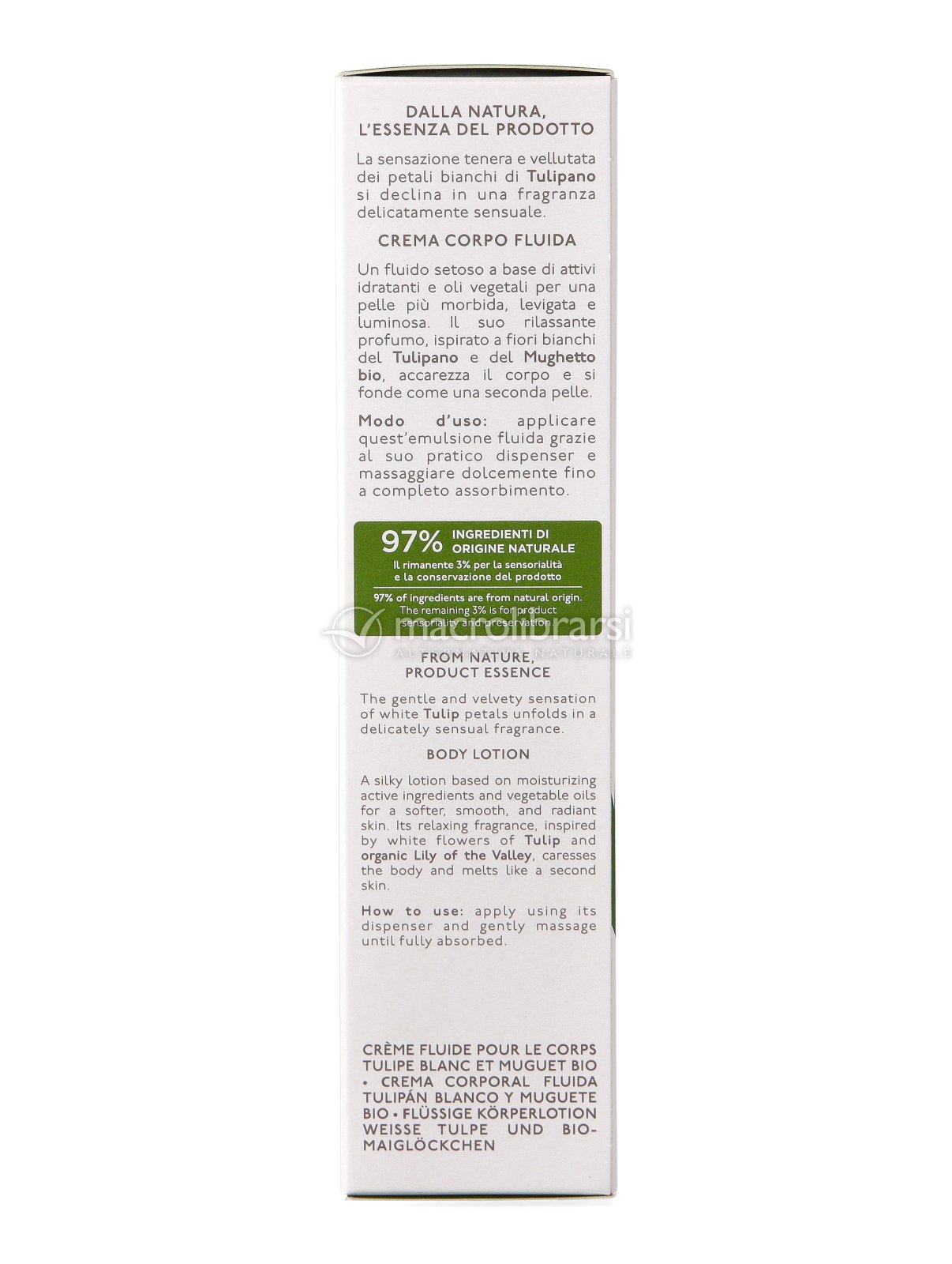 Questa crema corpo è arricchita con estratti di Tulipano bianco, che svolgono un’azione lenitiva, ed estratti di Mughetto bio, che hanno un effetto energizzante, avvolgendo il corpo in una delicata e prolungata profumazione che infonde una piacevole sensazione di benessere.