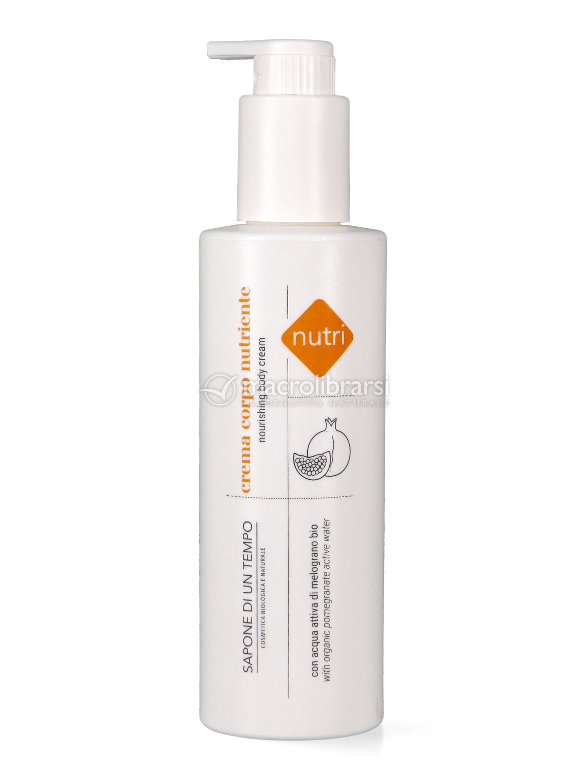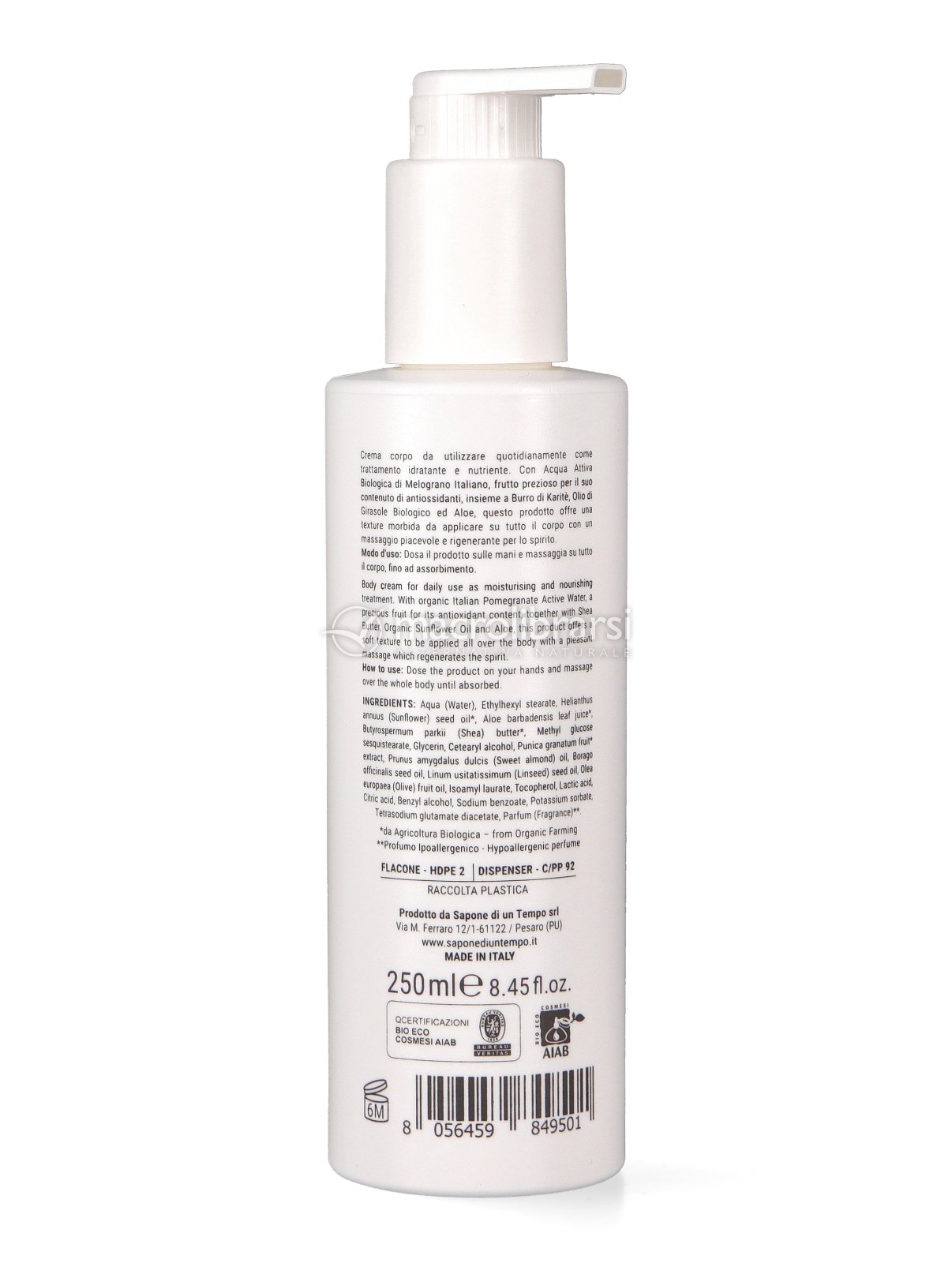 La caratteristica composizione della Crema Corpo Nutriente Bio Sapone di un Tempo unisce la preziosa acqua attiva biologica di Melograno italiano, altamente antiossidante, a burro di Karitè, olio di Girasole biologico ed Aloe, questo prodotto offre una texture morbida da applicare su tutto il corpo con un massaggio piacevole e rigenerante.