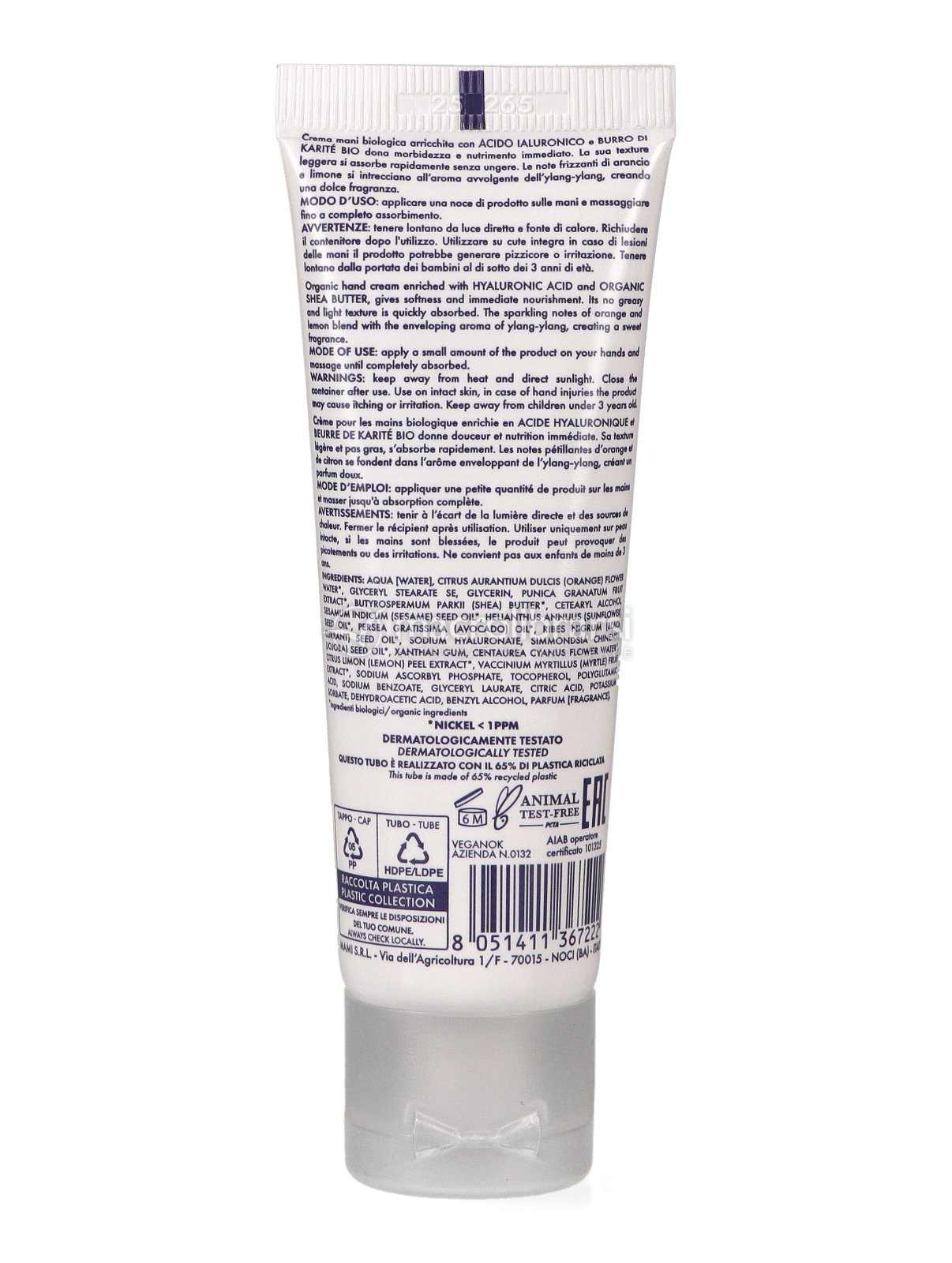 Questa crema mani puroBIO è arricchita con estratto biologico di fiori d'Arancio, burro di karitè bio, oli vegetali e acido ialuronico per donare nutrimento e morbidezza immediati alla pelle.