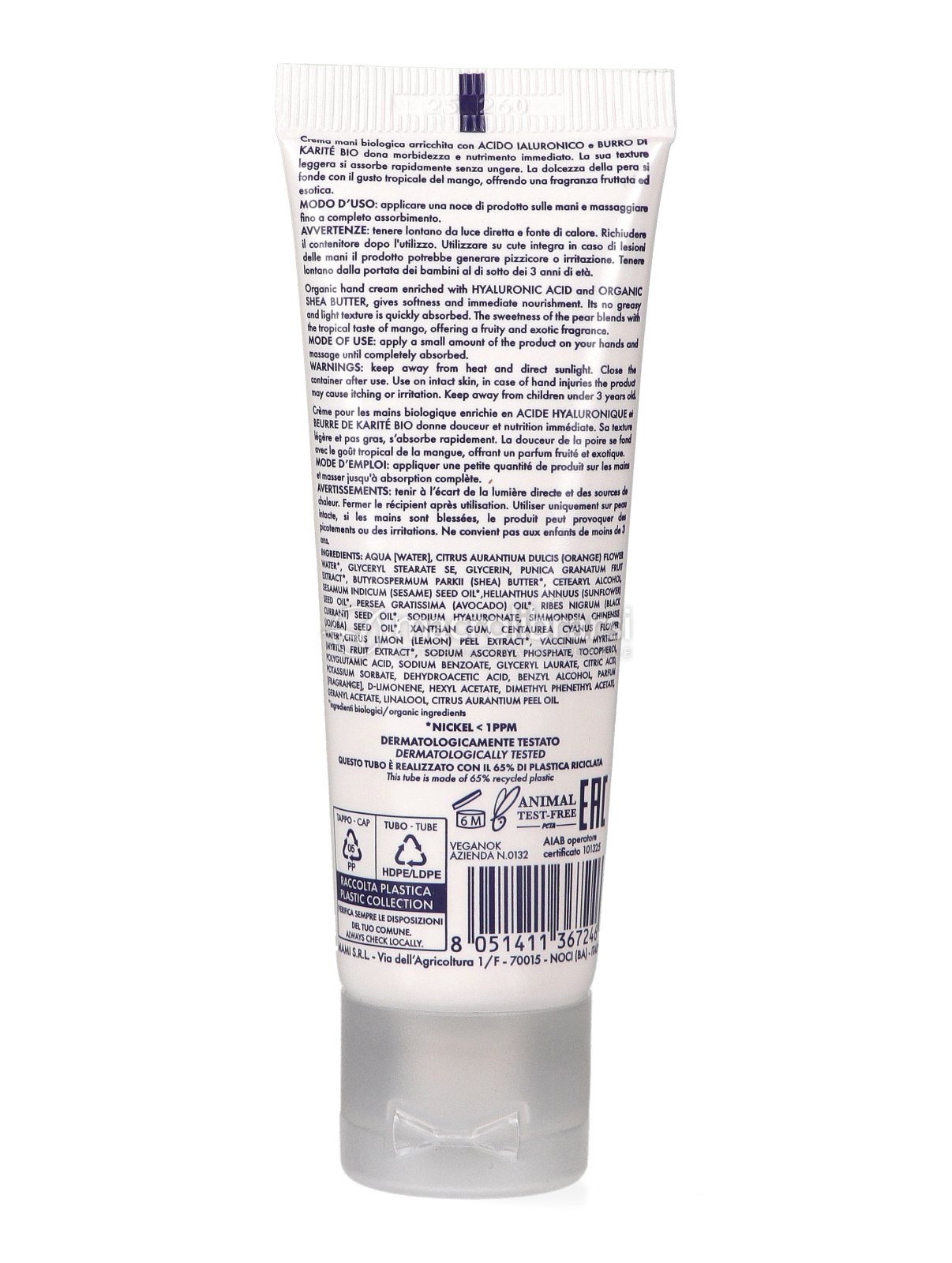 Questa crema mani puroBIO è arricchita con estratti biologici di Pera e mango, burro di karitè bio, oli vegetali e acido ialuronico per donare nutrimento e morbidezza immediati alla pelle.