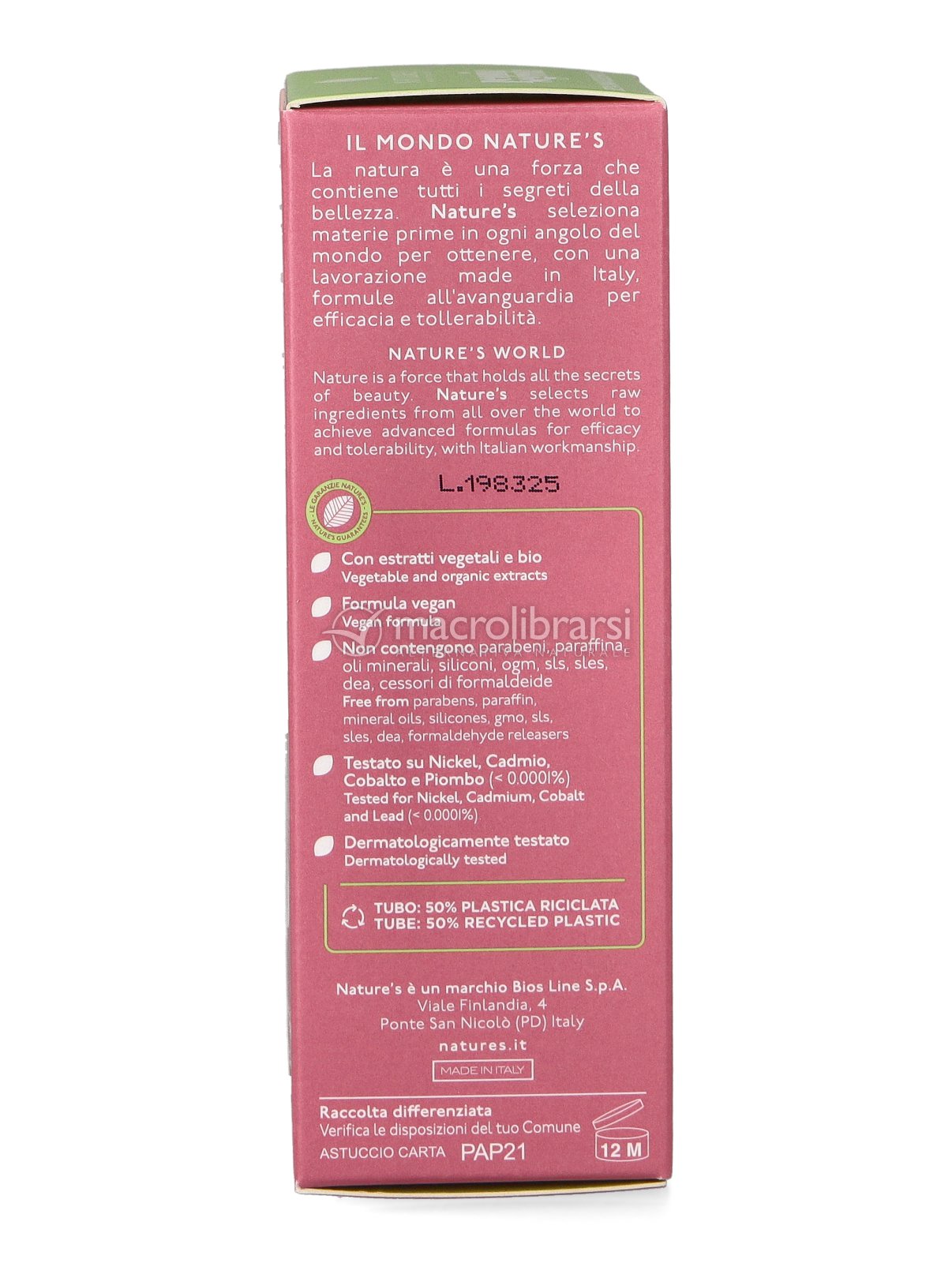 | Disclaimer | I dati riportati sulla confezione del prodotto (INCI, consigli di utilizzo, data di scadenza, certificazioni, etc) possono variare sulla base dell'aggiornamento delle formulazioni da parte dei produttori, dell'arrivo di un nuovo lotto e dell'adeguamento alle norme di legge. Vi preghiamo pertanto di fare sempre riferimento alle informazioni presenti in etichetta prima di utilizzare il prodotto acquistato. Le immagini riportate hanno uno scopo puramente indicativo e sono soggette a variazioni da parte dei produttori. |