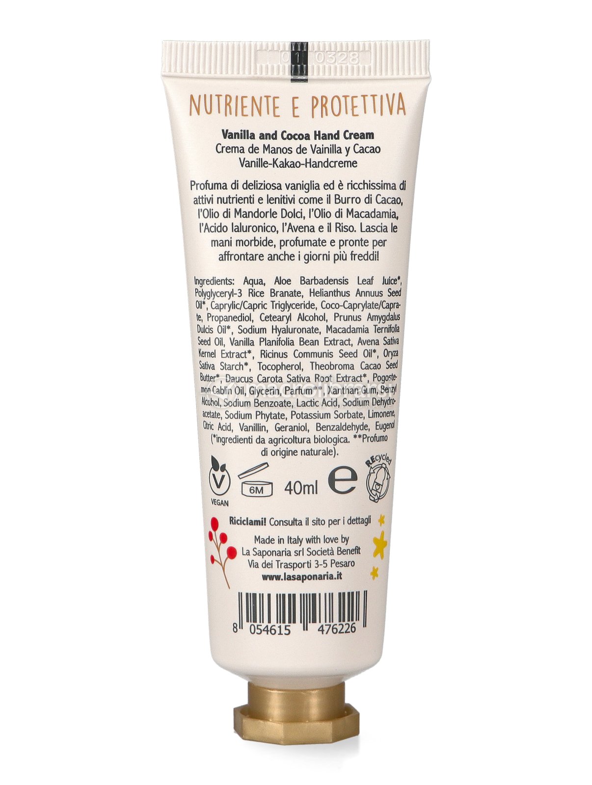 La formula dell'Eco Crema Mani Vaniglia e Cacao La Saponaria è ricchissima di attivi nutrienti e lenitivi come il burro di Cacao, l'olio di Mandorle dolci, l'olio di Macadamia, acido ialuronico, avena e riso per garantire mani sempre morbide e protette anche dal freddo più intenso!
