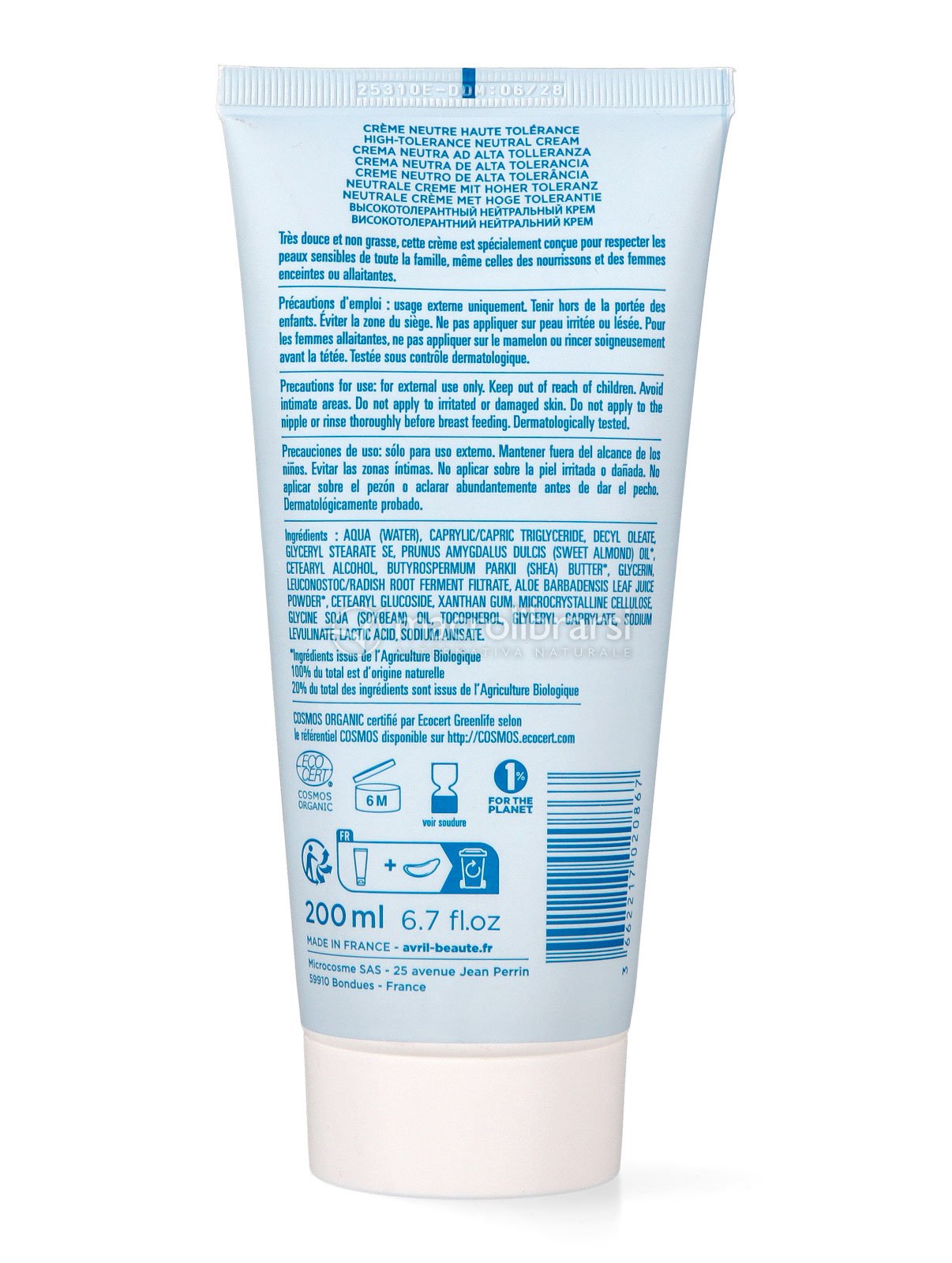 Crema neutra certificata biologica ad alta tollerabilità, formulata senza profumo aggiunto e adatta a tutta la famiglia.