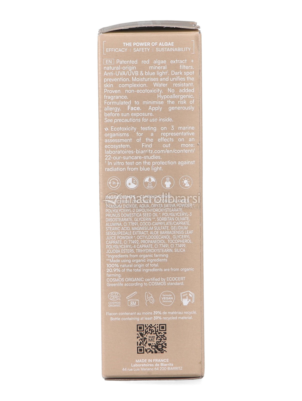 | Note | Note del produttore: Perché la parola [NANO] ora appare sul packaging dei prodotti solari Laboratoires de Biarritz con filtro minerale venduti esclusivamente in Francia e Svizzera? PERCHÉ? È dovuto ad un cambio nella tecnica di misurazione. Attualmente, non esiste una tecnica standardizzata per valutare le nanoparticelle. Esistono diverse tecniche e la normativa non impone di favorirsi l’una sull’altra. PRIMA: TECNICA DLS: Misura i filtri minerali come sono naturalmente presenti nei prodotti finiti e una volta che vengono applicati sulla pelle, nello specifico: rivestiti, agglomerati e formando grossi aggregati. ADESSO: TECNICA SEM: Modifica il reale stato degli schermi minerali e seleziona le particelle più piccole, prima della misurazione. Quindi, misura la dimensione più piccola di queste particelle. Solamente in Francia (e in Svizzera dal 2024), le organizzazioni di controllo utilizzano esclusivamente la tecnica SEM (Scanning Electron Microscopy), quindi nell’INCI di tutte le creme solari vendute esclusivamente sul mercato francese e svizzero, basate su filtri minerali e che dichiarano una protezione UVA e UVB appare la parola [nano] in etichetta. COSA CAMBIA? Niente. Le formule Laboratoires de Biarritz non sono cambiate e sono completamente sicure, perché: