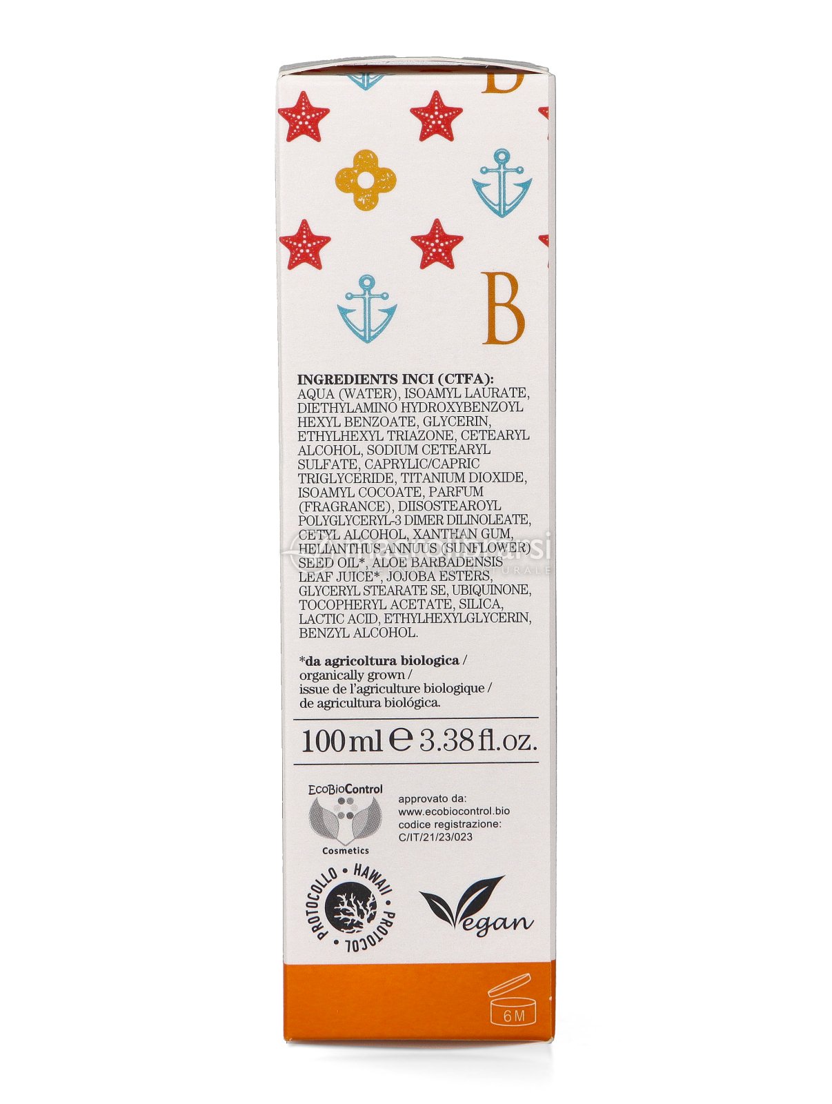 Aqua (Water), Isoamyl Laurate, Diethylamino Hydroxybenzoyl Hexyl Benzoate, Glycerin, Ethylhexyl Triazone, Cetearyl Alcohol, Sodium Cetearyl Sulfate, Caprylic/capric Triglyceride, Titanium Dioxide, Isoamyl Cocoate, Parfum (Fragrance), Diisostearoyl Polyglyceryl-3 Dimer Dilinoleate, Cetyl Alcohol, Xanthan Gum, Helianthus Annuus (Sunflower) Seed Oil*, Aloe Barbadensis Leaf Juice*, Jojoba Esters, Glyceryl Stearate Se, Ubiquinone, Tocopheryl Acetate, Silica, Lactic Acid, Ethylhexylglycerin, Benzyl Alcohol. - *da agricoltura biologica