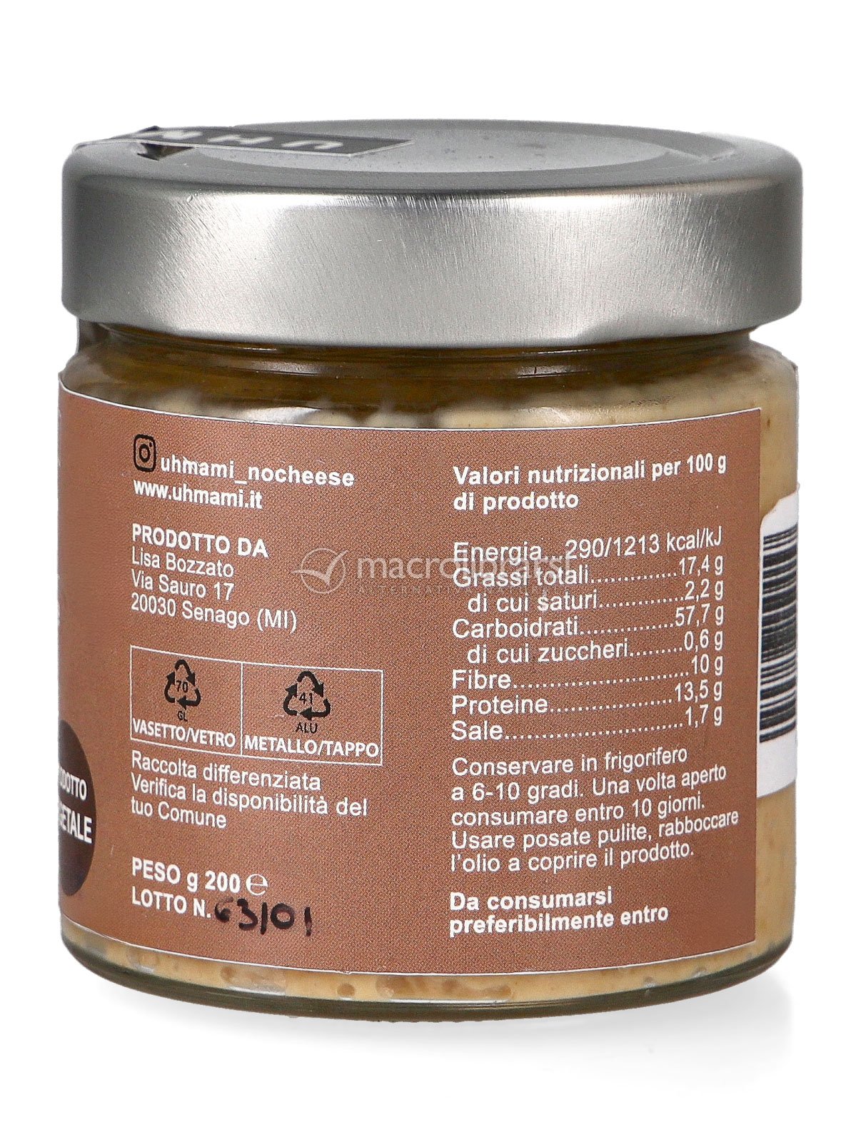 UHMAMI è un non-formaggio 100% vegetale, realizzato con una ricetta semplice e pulita: senza additivi, senza coadiuvanti di produzione e senza correttori di acidità. La lavorazione avviene in modo completamente artigianale. La sua bontà nasce da una fermentazione in salamoia di circa 21 giorni, un processo lento che favorisce lo sviluppo di batteri di microrganismi naturalmente presenti, contribuendo a definire gusto e personalità del prodotto.