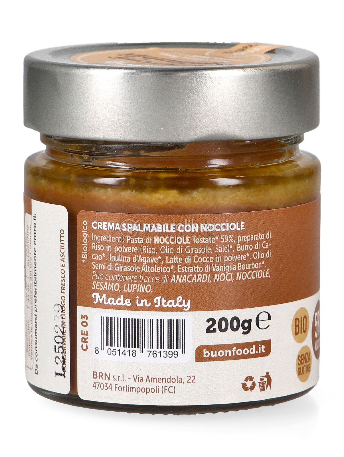 Deliziosa crema spalmabile alla Nocciola BRN FOOD con ingredienti biologici certificati: pasta di Nocciole e Cacao in polvere.
