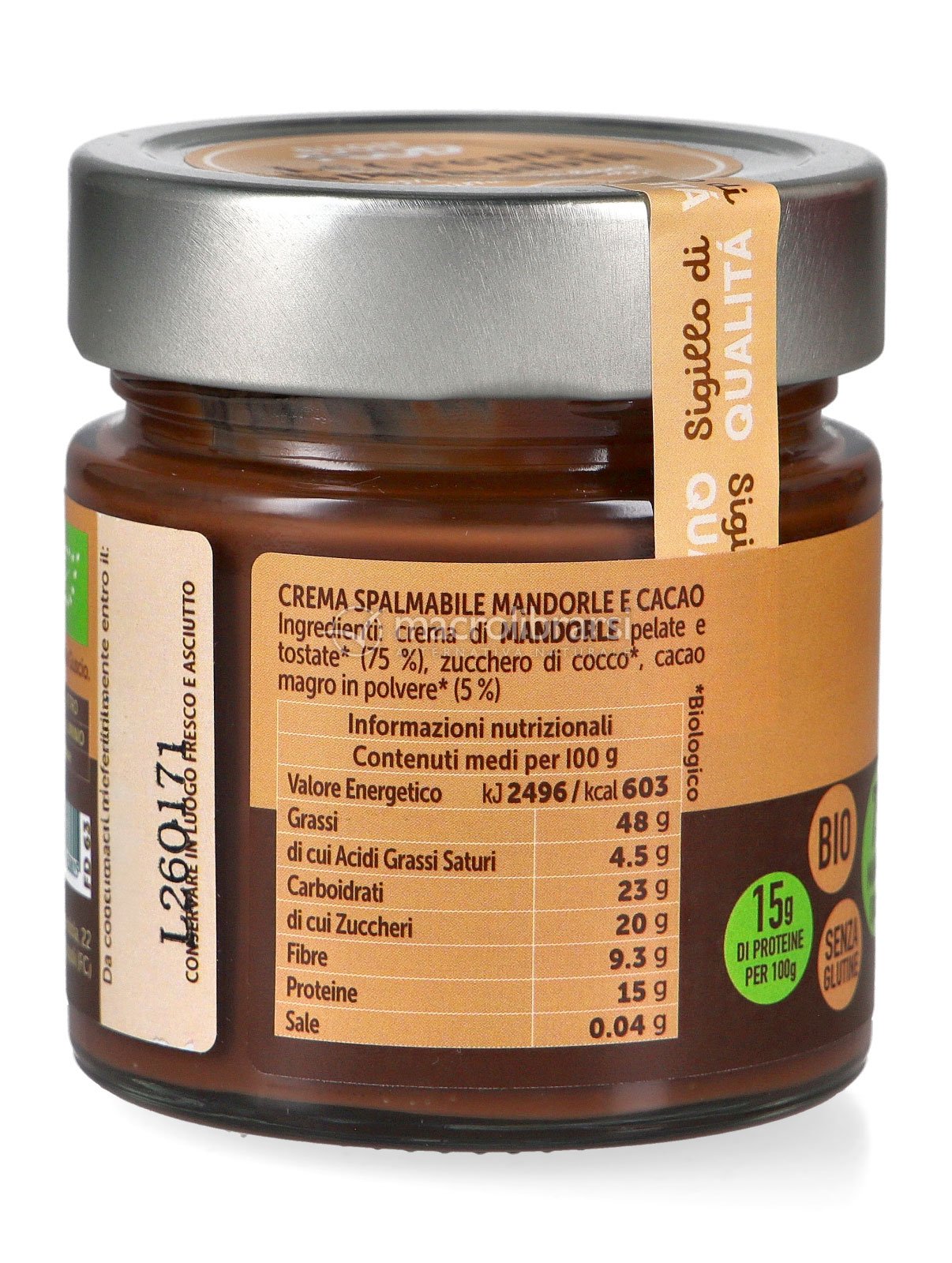 Una crema spalmabile biologica a base di mandorle italiane e cacao, dal gusto armonioso e naturalmente intenso.