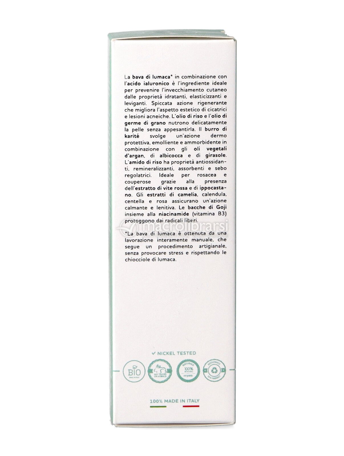 Note | La bava di lumaca utilizzata per la formulazione dei prodotti BisouBio è ottenuta da una lavorazione interamente manuale, che segue un procedimento artigianale che non provoca stress e rispetta le chiocciole di lumaca. |