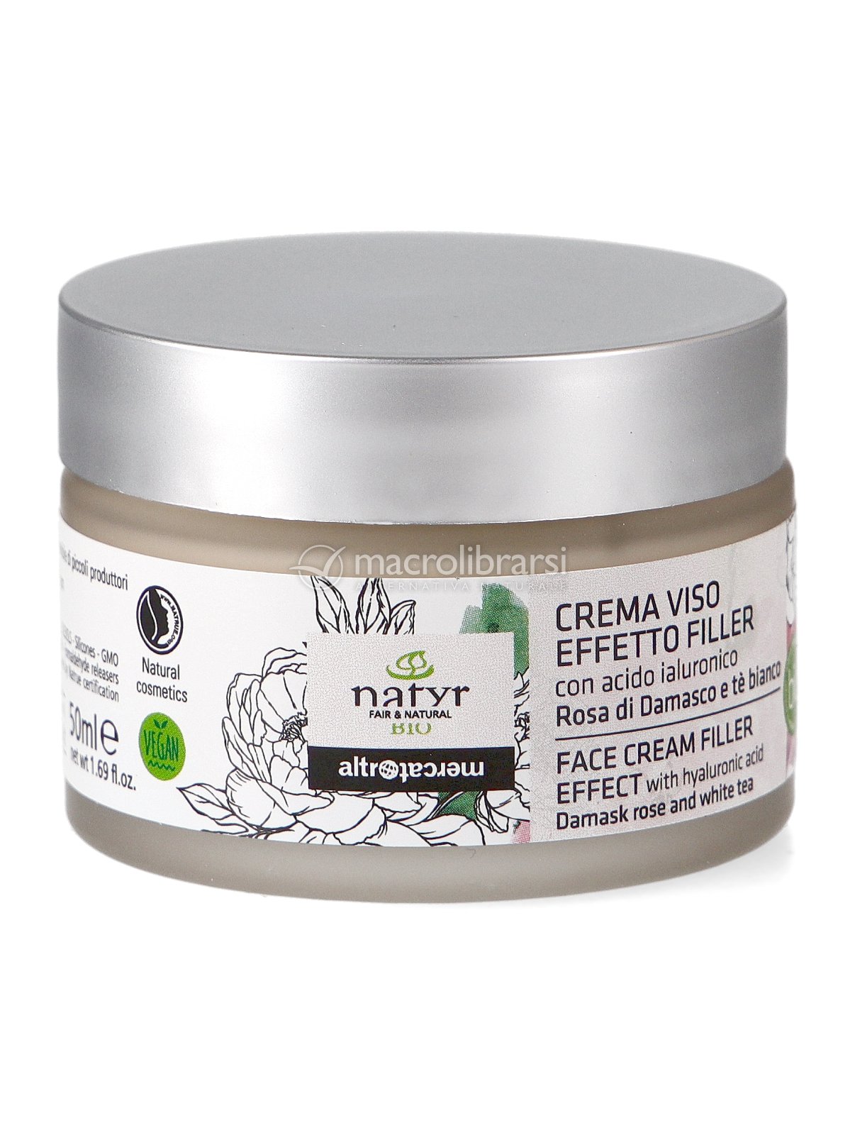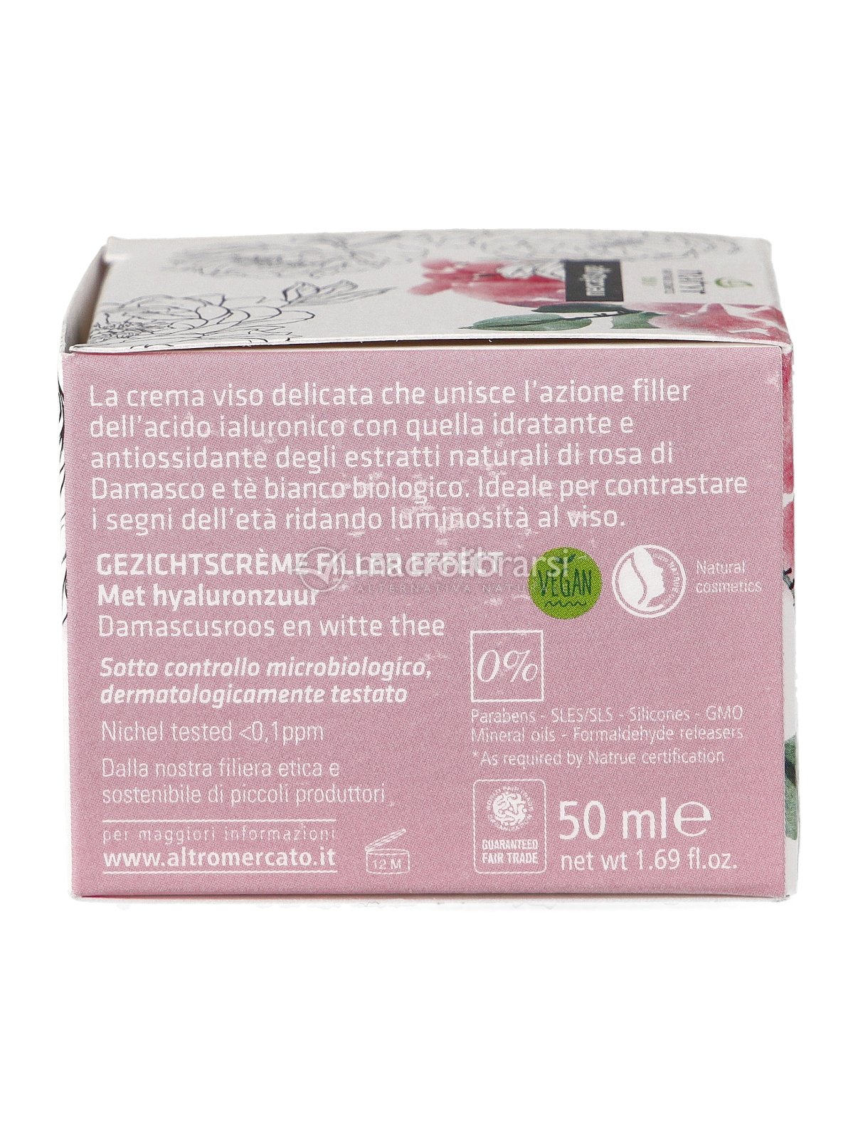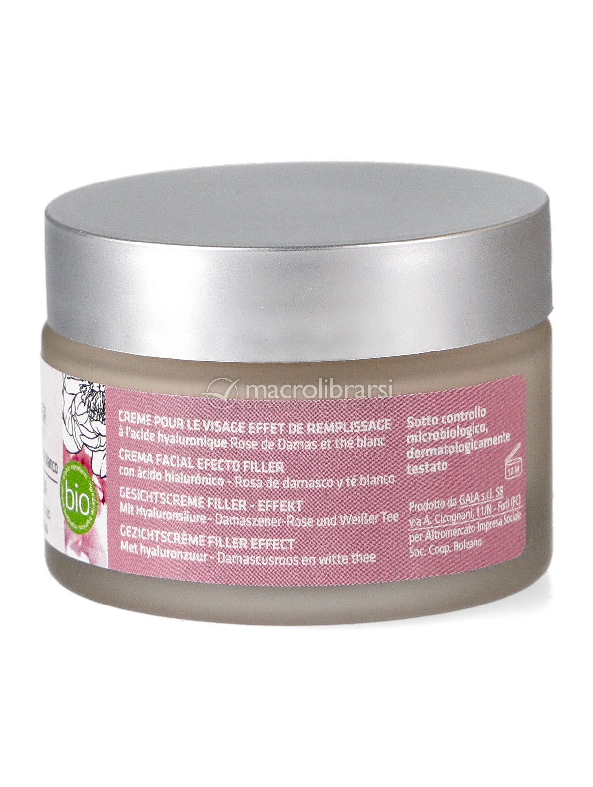 Crema viso delicata arricchita con Rosa damascena equosolidale, acido ialuronico vegetale ed estratti naturali per un'azione filler e antirughe completa ed efficace.