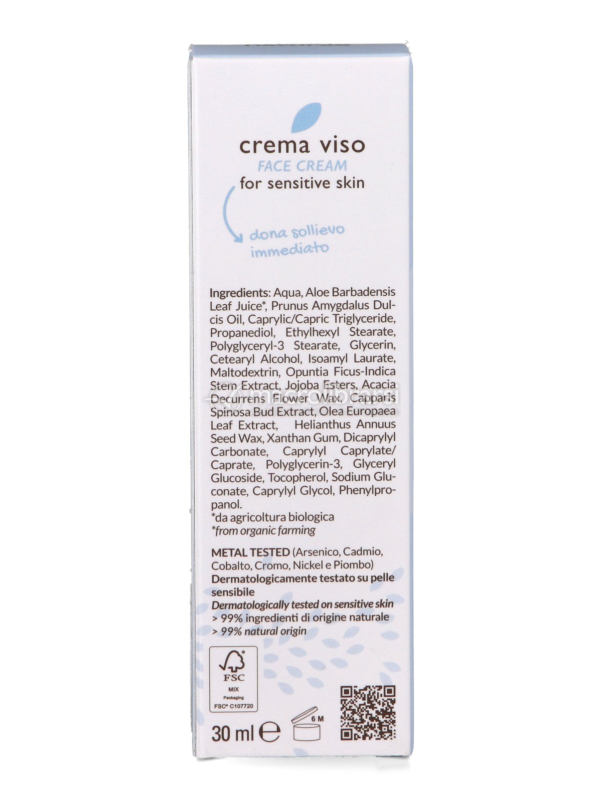 Crema viso biologica senza profumo specificatamente formulata per lenire e idratare la pelle allergica e altamente intollerante, reattiva e soggetta a rossori.