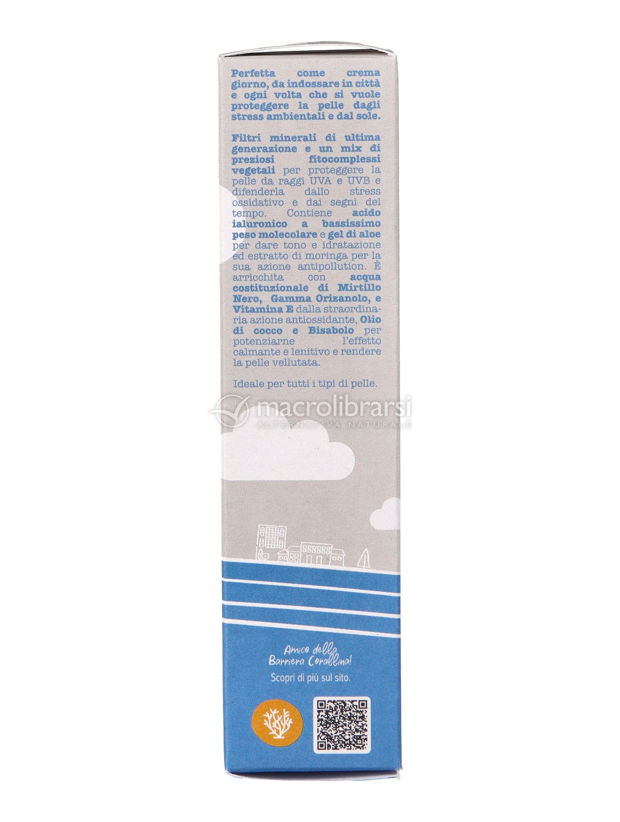 Crema solare per il viso leggermente pigmentata per uniformare ed illuminare mentre svolge una tripla azione contro i raggi UV, lo smog e segni del tempo.