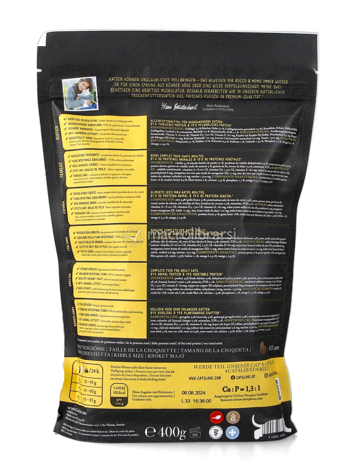 Grazie al contenuto ottimale di proteine (81% proteine animali e 19% proteine vegetali), le crocchette Cat's Love aiutano il tuo micio a mantenere il suo peso forma e contribuiscono a salvaguardare la salute delle vie urinarie grazie al contenuto moderato di minerali.