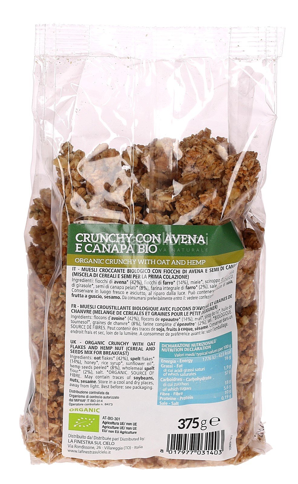 Molto buono questo crunchy, è perfetto per la mia colazione. L''avena e la canapa hanno tante qualità e li uso regolarmente.