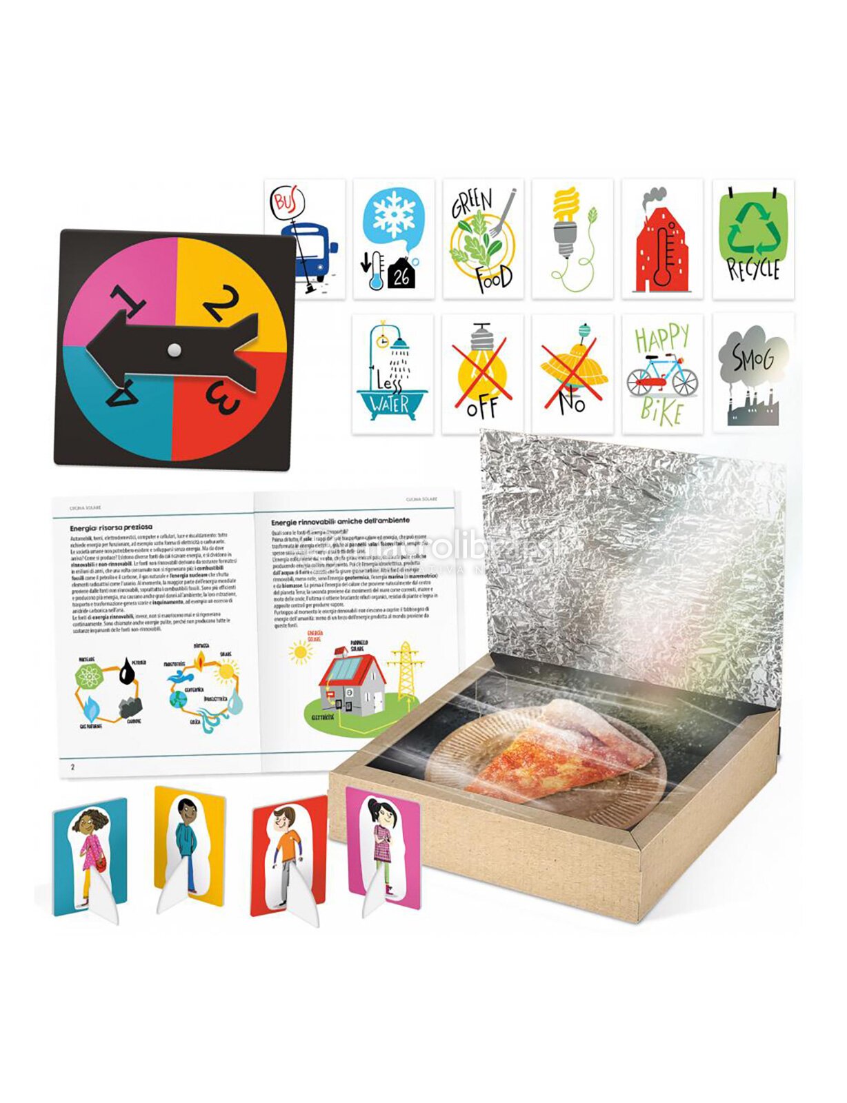 La confezione comprende una scatolina da montare, foglio di alluminio, spago bianco, gancetti, foglio in plastica trasparente, piattino compostabile, spinner, 4 pedine, 25 carte, 30 gettoni verdi, un libretto.