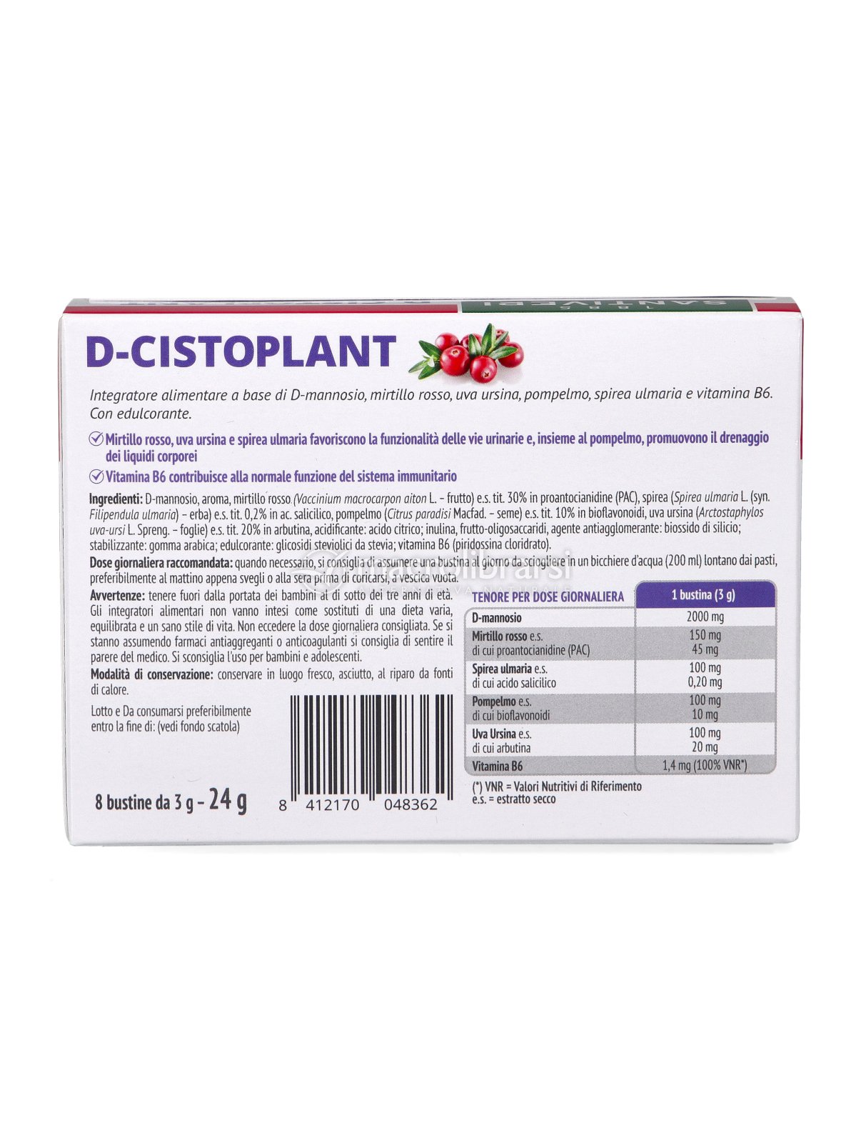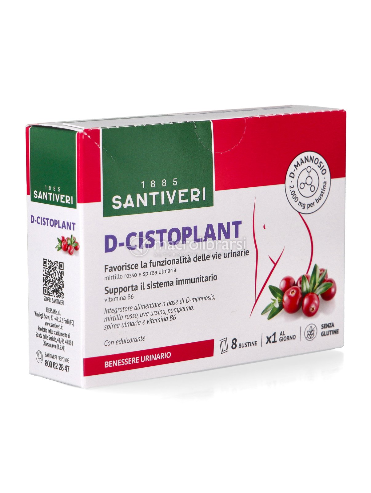 D-Cistoplant di Santiveri è un integratore alimentare in bustine a base di D-mannosio, arricchito con estratti vegetali come mirtillo rosso, uva ursina, pompelmo e spirea ulmaria.