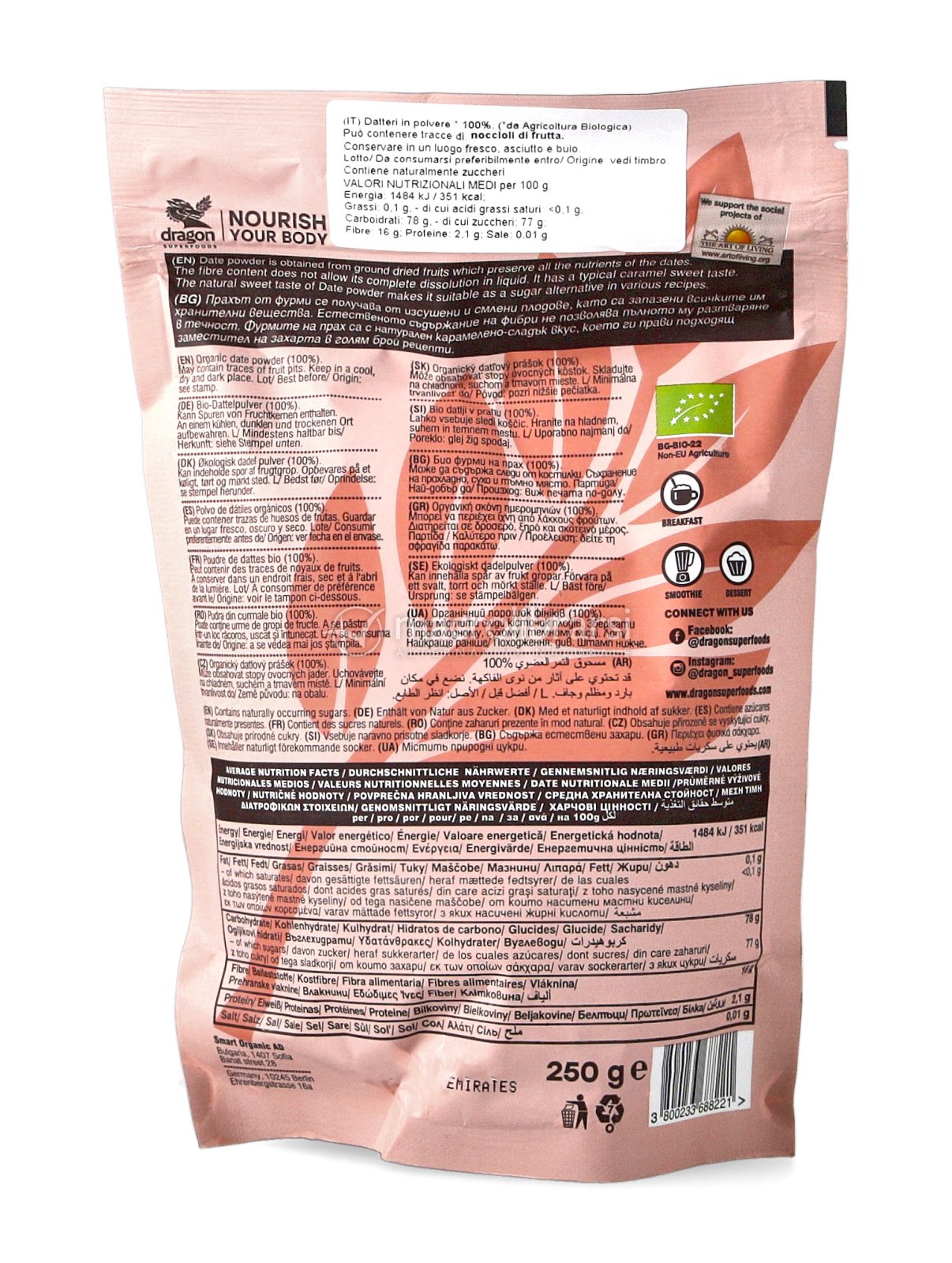 I datteri in polvere di Dragon Superfood si ottengono dai frutti essiccati e macinati delicatamente solo così conserva tutti i nutrienti del prodotto fresco.