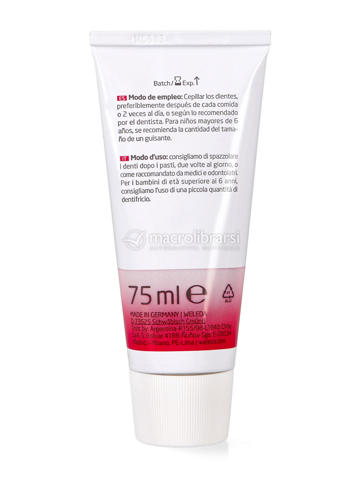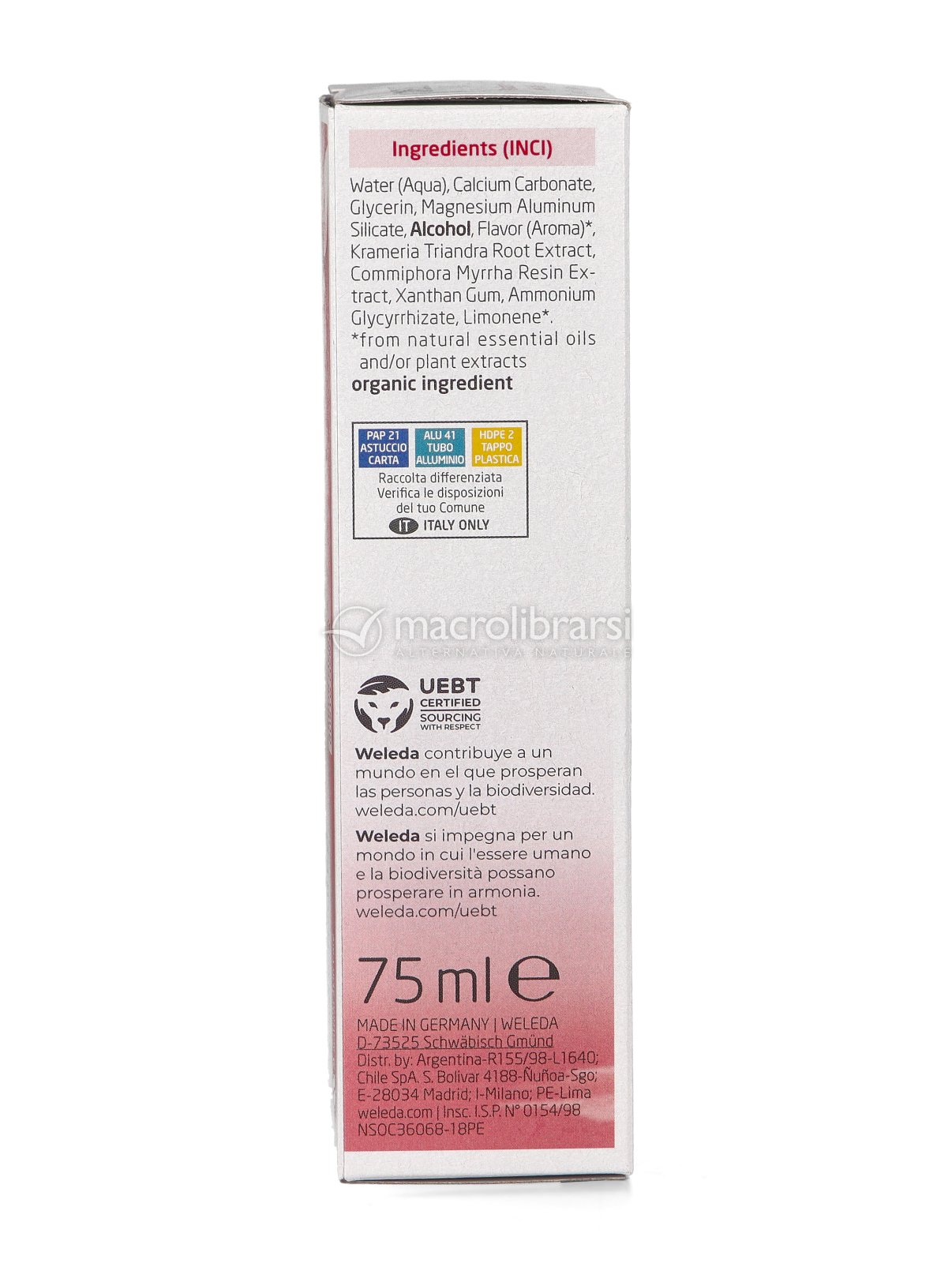 Gli estratti di radice di ratania e mirra, dalle proprietà astringenti e igienizzanti, aiutano a proteggere e mantenere sane le gengive. Le particelle di carbonato di calcio detergono in modo efficace, contribuendo a rimuovere la placca senza aggredire lo smalto, e aiutano a proteggere dalla carie.
