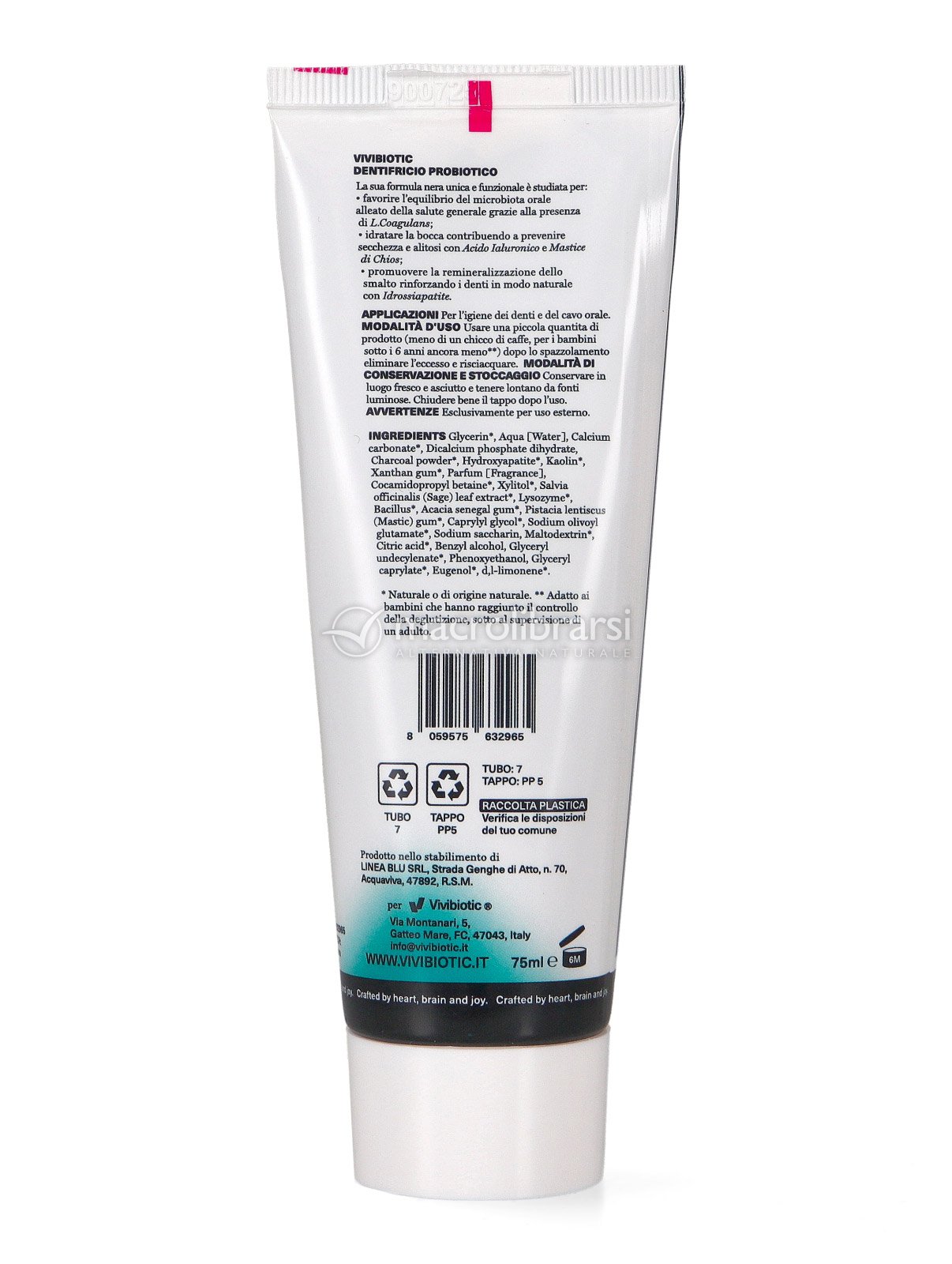 Pasta dentifricia a base di carbone attivo, prebiotici e principi attivi utili per l'equilibrio del microbiota orale e la mineralizzazione dentale.