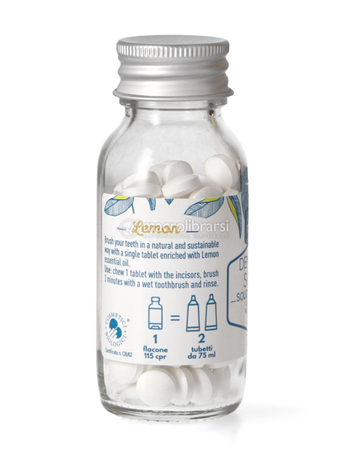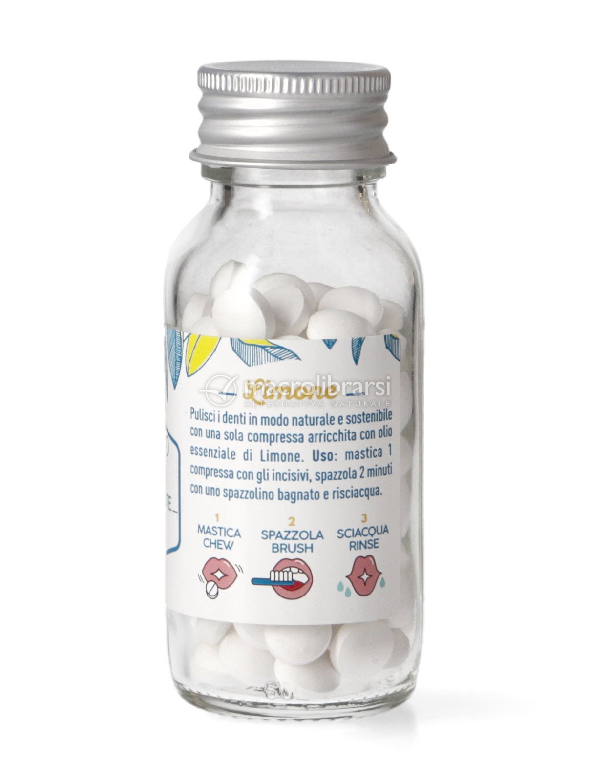 Dentifricio solido in pastiglie al gusto limone per lavare i denti in modo naturale, sostenibile e consapevole, senza plastica e senza creare rifiuti.