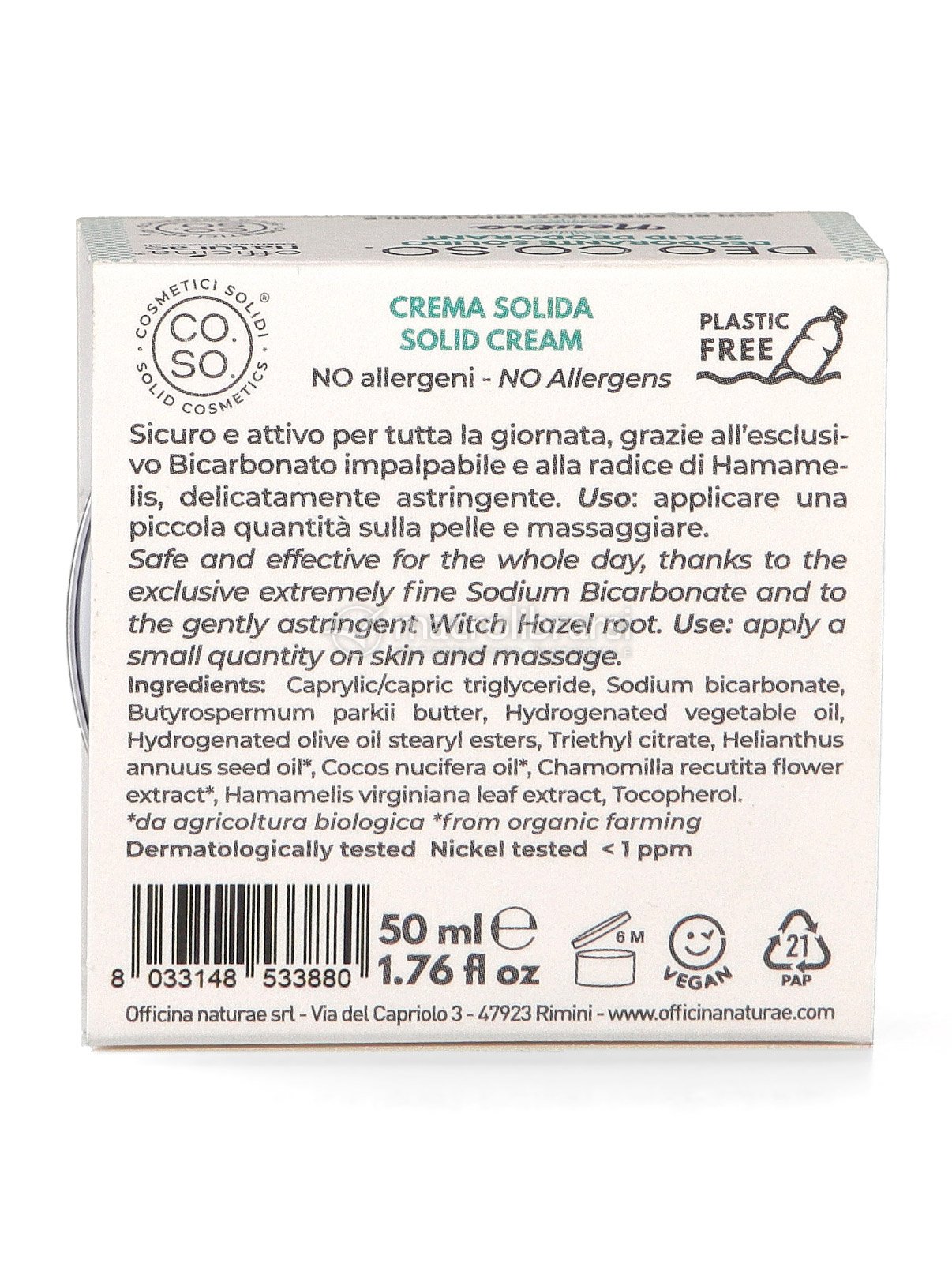 È un deodorante solido naturale formulato con un esclusivo bicarbonato impalpabile, più piacevole da applicare perché privo della classica granulosità che può risultare irritante. L’estratto di hamamelis offre un leggero effetto astringente: aiuta a regolare la sudorazione senza bloccare la traspirazione, lasciando la pelle asciutta e naturalmente protetta in ogni momento della giornata.