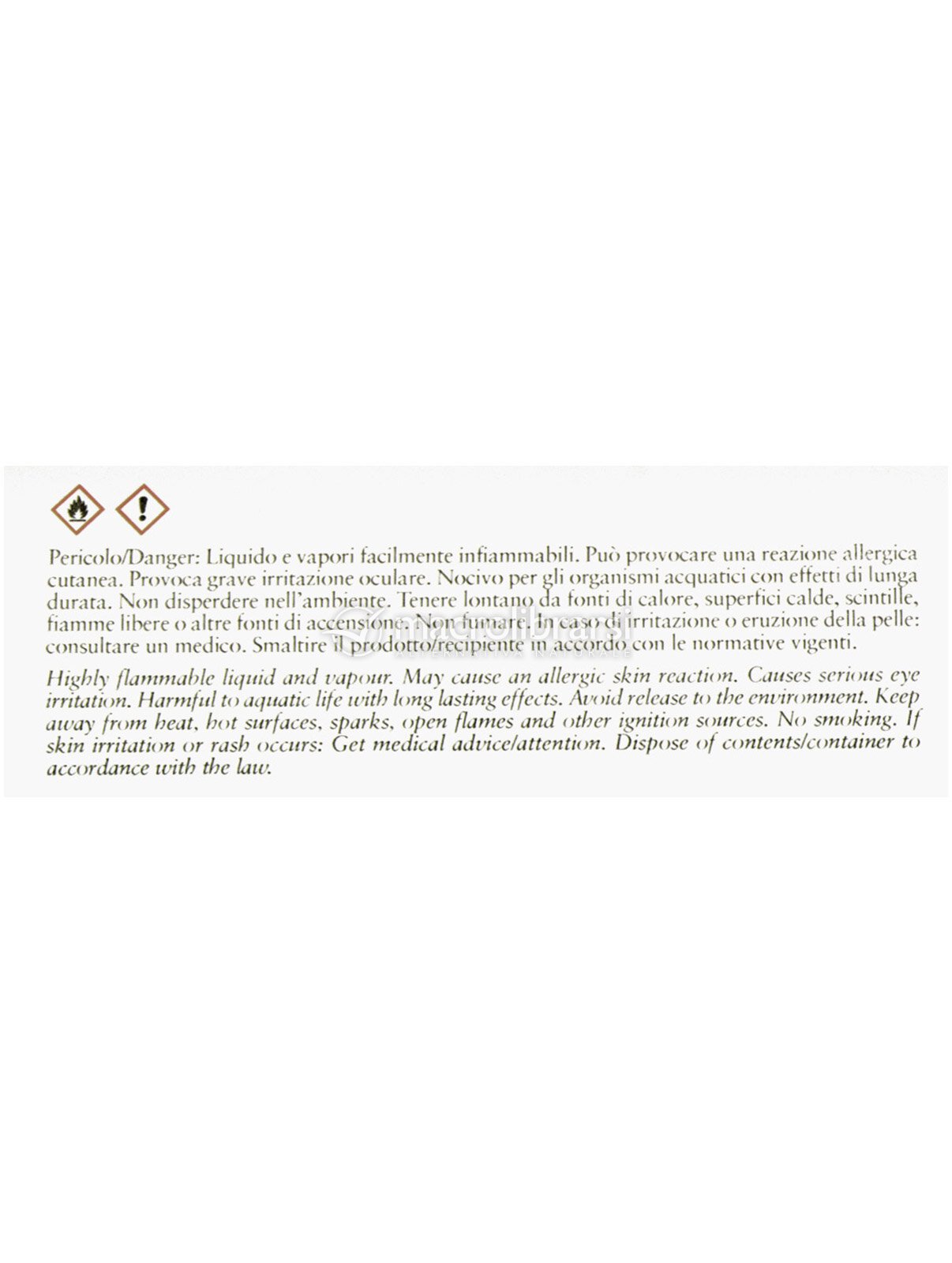 | Avvertenze | Liquido e vapori facilmente infiammabili. Può provocare una reazione allergica cutanea. Provoca grave irritazione oculare. Nocivo per gli organismi acquatici con effetti di lunga durata. Non disperdere nell'ambiente. Tenere lontano da fonti di calore, superfici calde, scintille, fiamme libere o altre fonti di accensione. Non fumare. In caso di irritazione o eruzione della pelle: consultare un medico. Smaltire il prodotto/recipiente in accordo con le normative vigenti. |