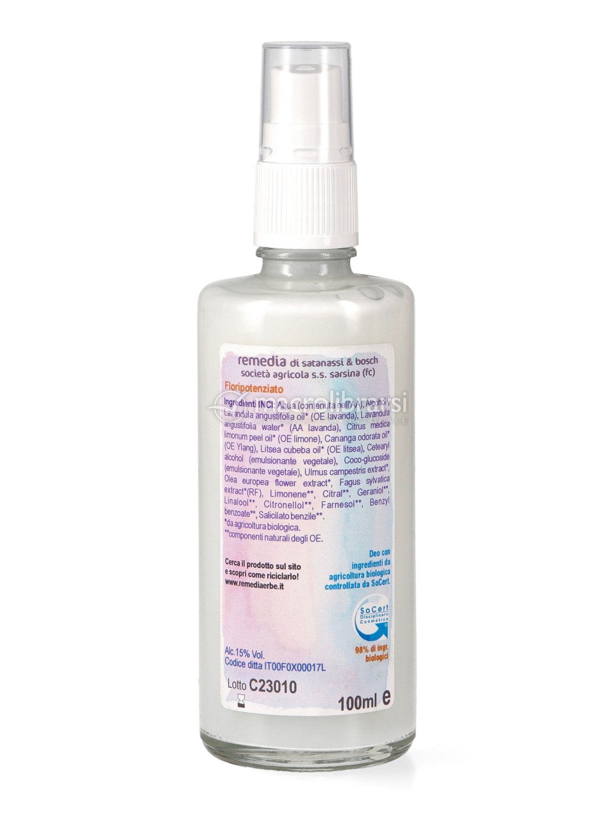 Composizione: idrolato di lavanda, alcol, oli essenziali di lavanda, limone, ylang-ylang, litsea, emulsionante vegetale, rimedi floreali di elm, olive, beech.