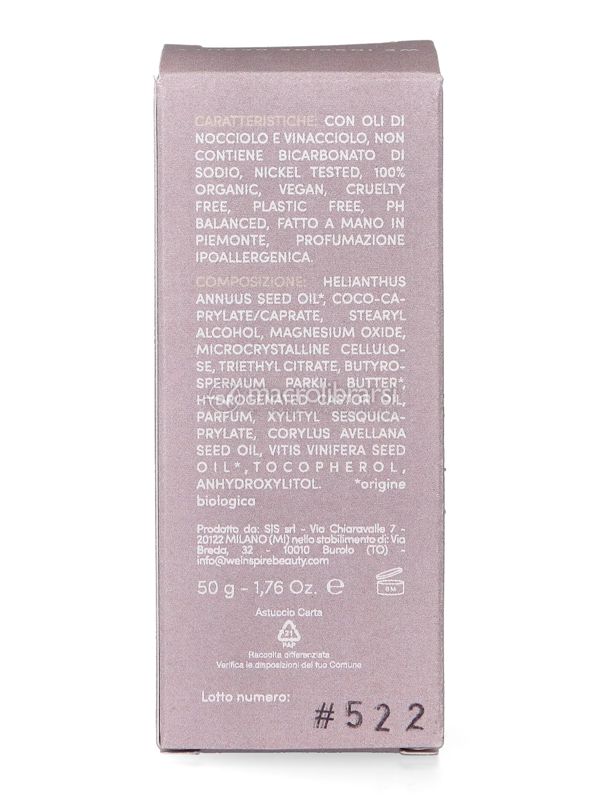 Arricchito con burro di Karité per facilitarne l'applicazione, la sua formula naturale testata al nickel e senza sali di alluminio contiene olio di nocciola antiossidante, purificante e remineralizzante, unito all'olio di vinaccioli per proteggere la pelle dall'invecchiamento precoce, idratandola a fondo.