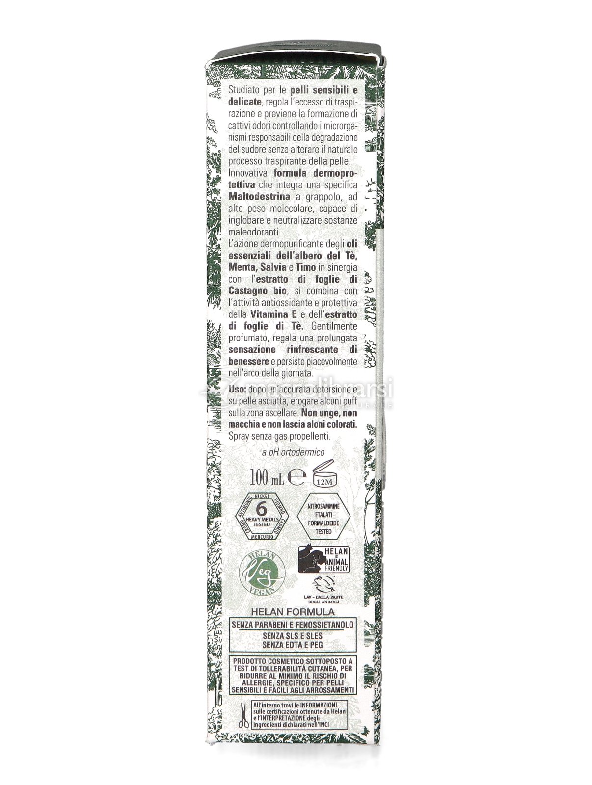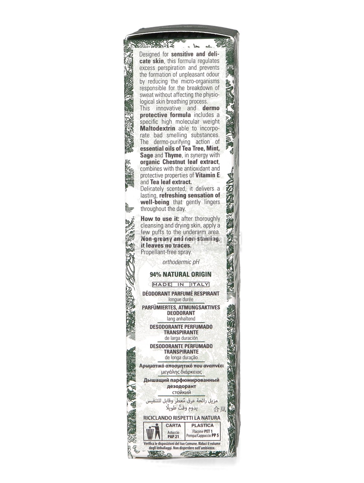 La sua formula innovativa al 94% di origine naturale integra una speciale Maltodestrina a grappolo ad alto peso molecolare, in grado di inglobare e neutralizzare le sostanze maleodoranti alla fonte. In sinergia, gli oli essenziali di Albero del Tè, Menta, Salvia e Timo svolgono un’azione dermopurificante e antibatterica, mentre l’estratto bio di foglie di Castagno e il Tè verde proteggono e riequilibrano la pelle con la loro azione antiossidante.