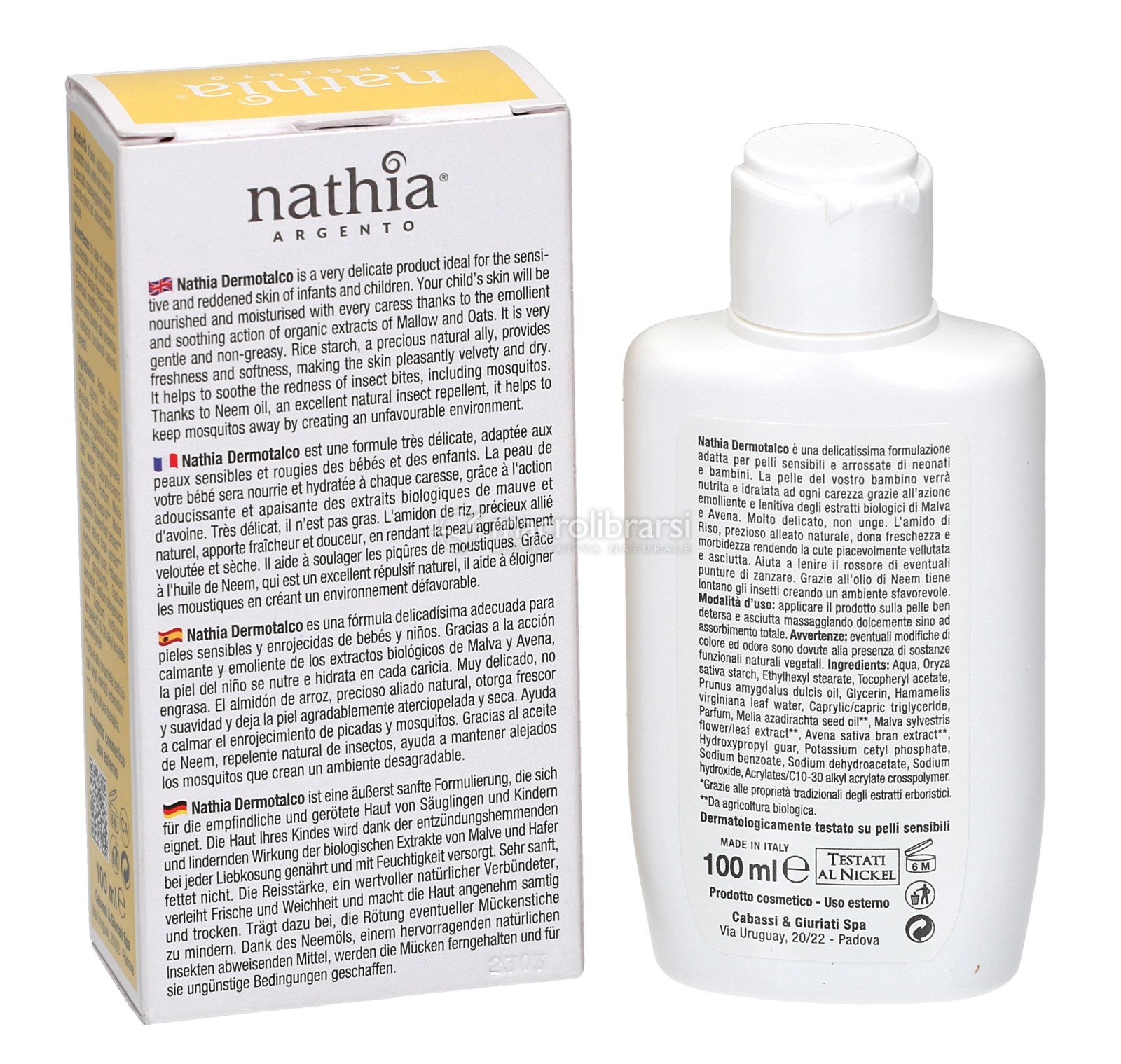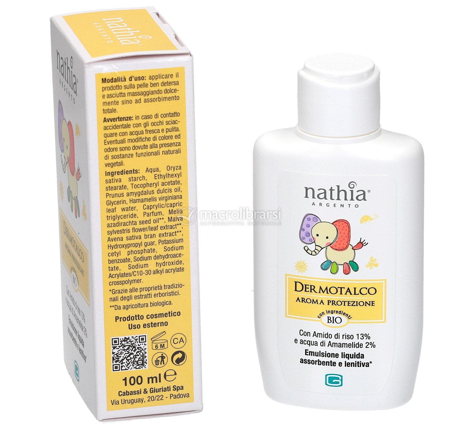 Il DermoTalco Nathia è una miscela di attivi la cui sinergia rende il prodotto altamente compatibile con la naturale traspirazione cutanea del bambino e, allo stesso tempo, efficace nel lenire arrossamenti e irritazioni frequenti nel piccolo appena nato.