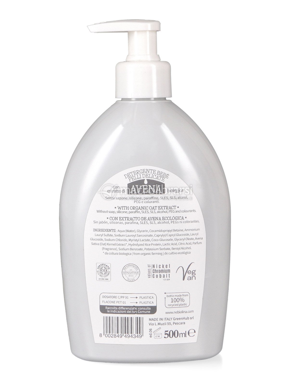 La formula è ulteriormente arricchita dalle proteine del Riso e dai preziosi elementi contenuti nell'estratto biologico del chicco d'Avena. Il prodotto garantisce una sicura igiene alla pelle del bambino nel rispetto del suo delicato equilibrio.