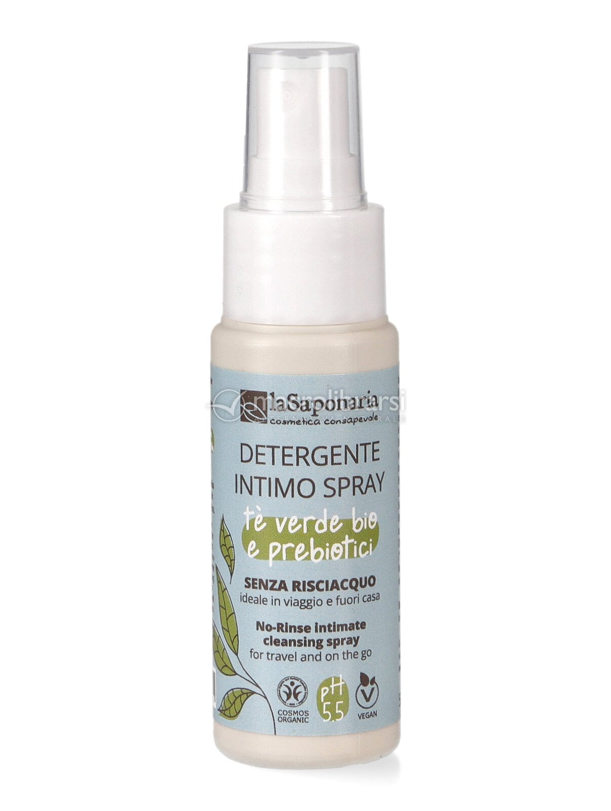Il Detergente Intimo Spray senza risciacquo Tè Verde Bio & Prebiotici di La Saponaria è praticissimo da utilizzare: basta spruzzarne un po’ sulla carta igienica per essere puliti quando non è possibile lavarsi con acqua.