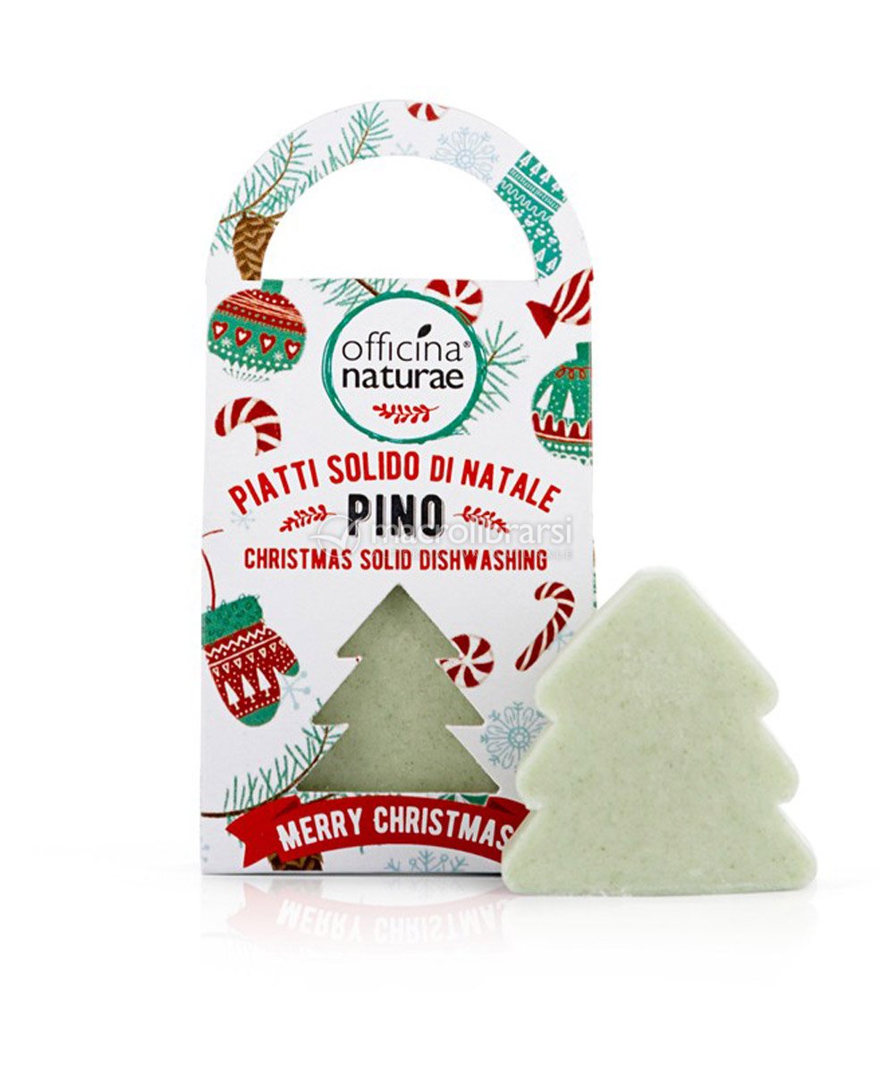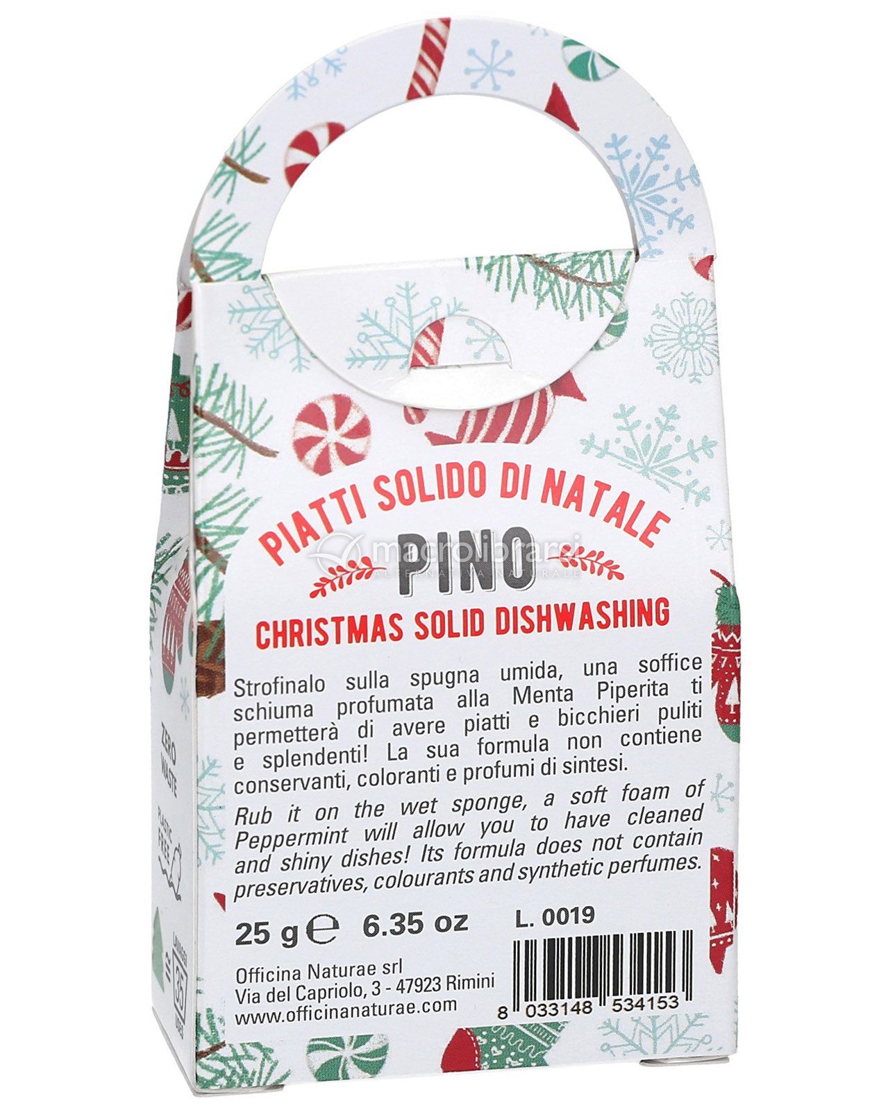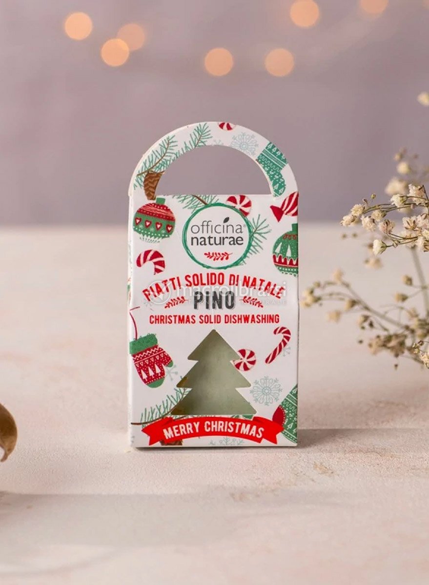 Il Detersivo Piatti Solido alla Menta Piperita a forma di alberello è contenuto in un simpatico astuccio in cartoncino decorato da appendere all’albero.