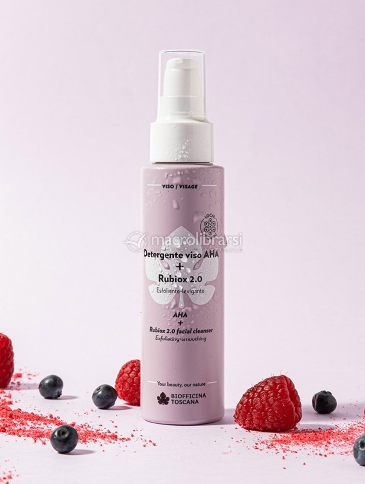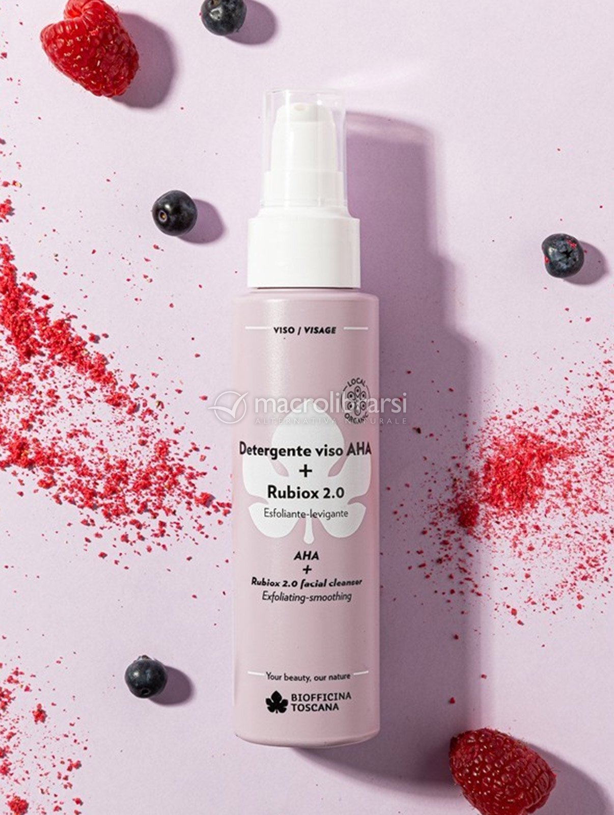 La presenza di Rubiox® 2.0, ottenuto da rosa canina e frutti rossi bio toscani, dona un’azione antiossidante che protegge e illumina il viso. I tensioattivi vegetali detergono con delicatezza, lasciando la pelle morbida, fresca e naturalmente luminosa.
