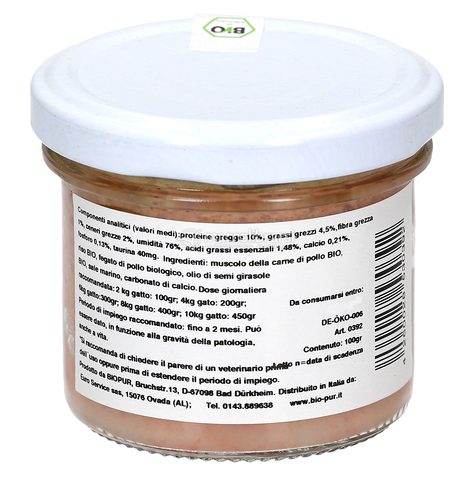Muscolo della carne di pollo Bio, Riso Bio, Fegato di pollo Bio, carbonato di calcio, sale marino, olio di semi di girasole Bio 1° spremitura