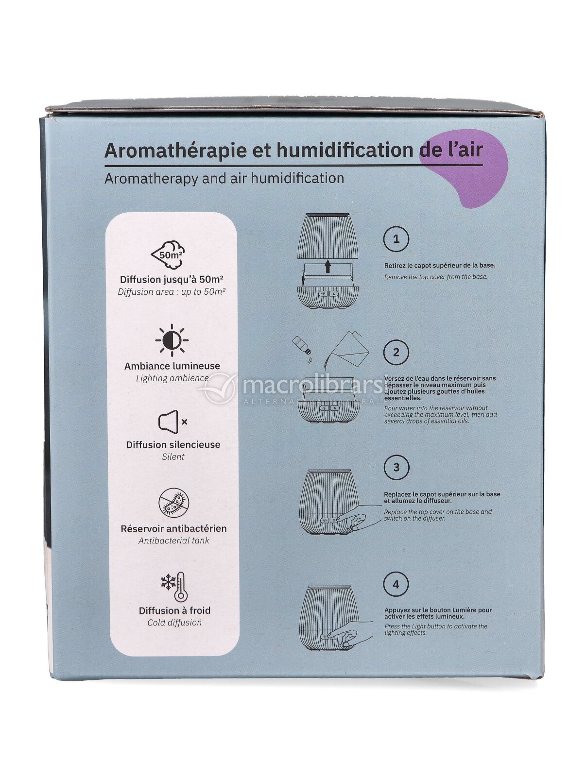 Pensato per spazi fino a 50 m², consente di scegliere tra una diffusione continua o intermittente, adattandosi facilmente alle diverse esigenze. È inoltre dotato di luci LED regolabili, con possibilità di selezionare la variazione automatica dei colori oppure mantenere una tonalità fissa, creando un’atmosfera rilassante e personalizzata.