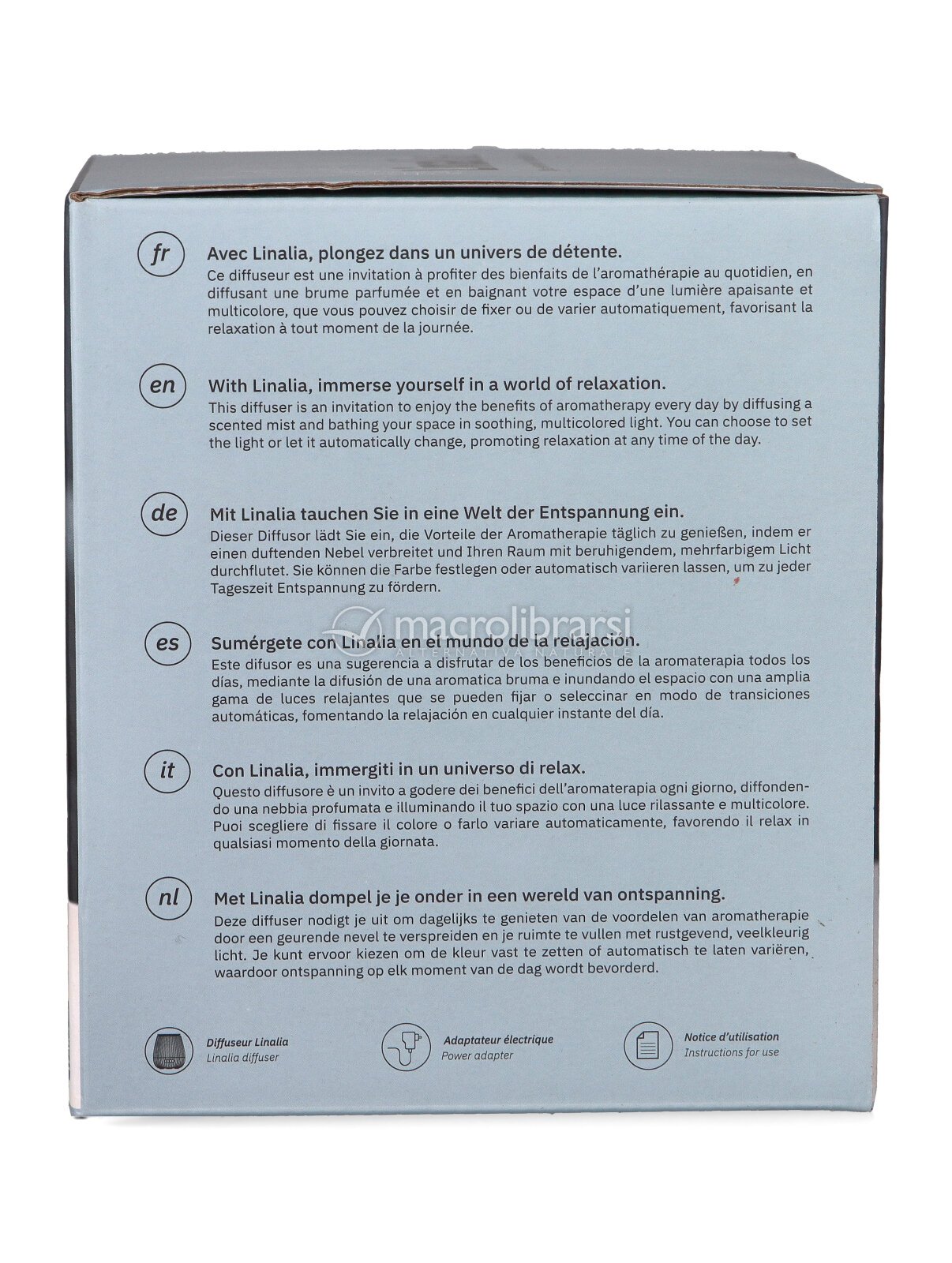 | Confezione | Diffusore 100 ml + cavo USB con adattatore rete elettrica + manuale istruzioni |