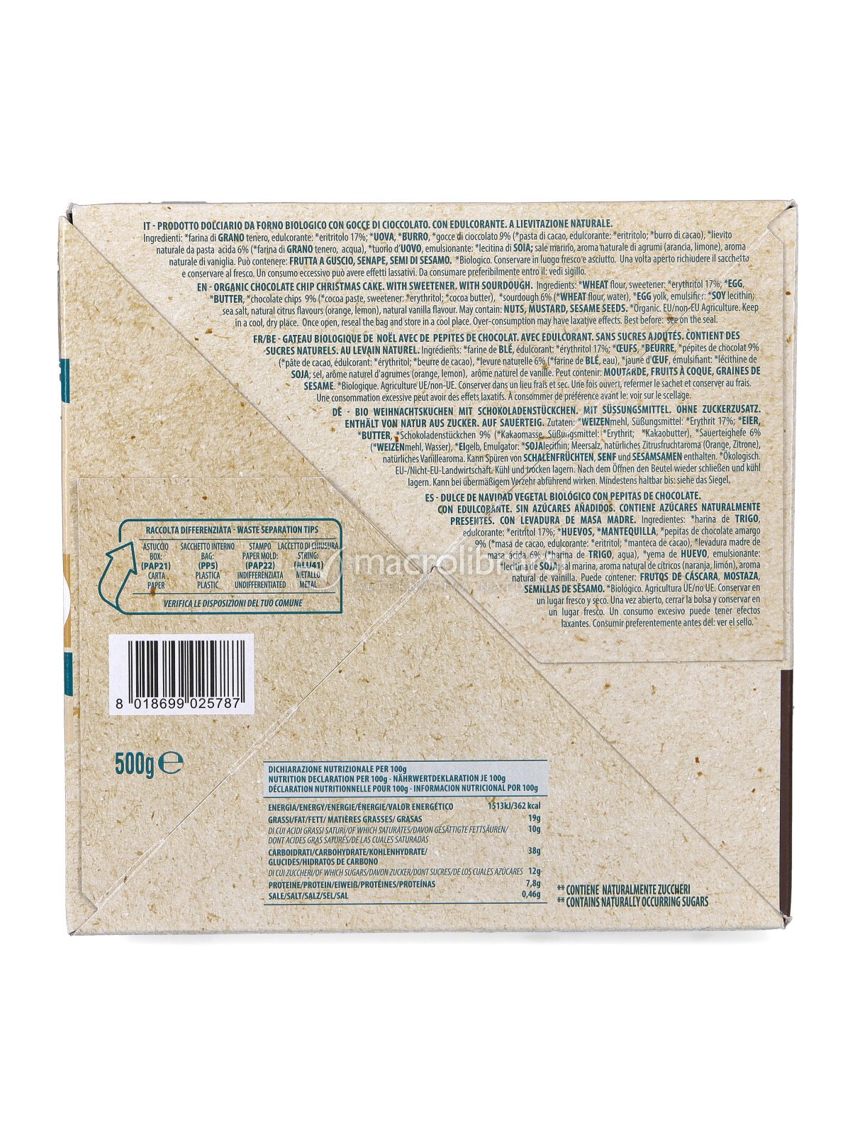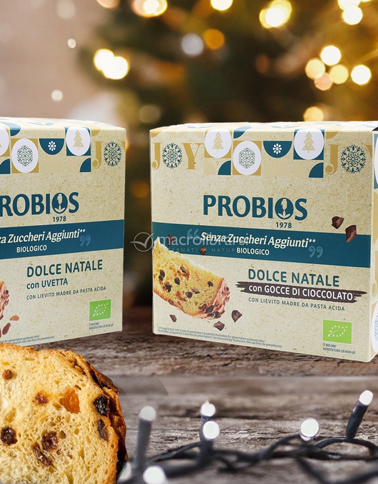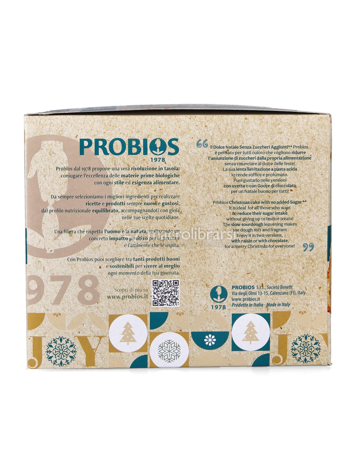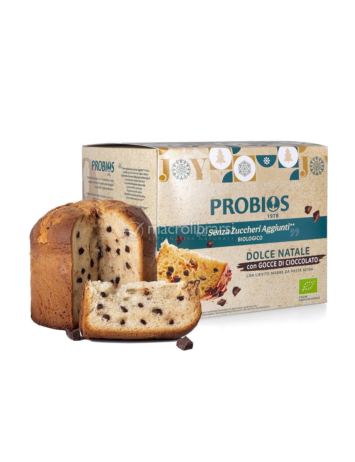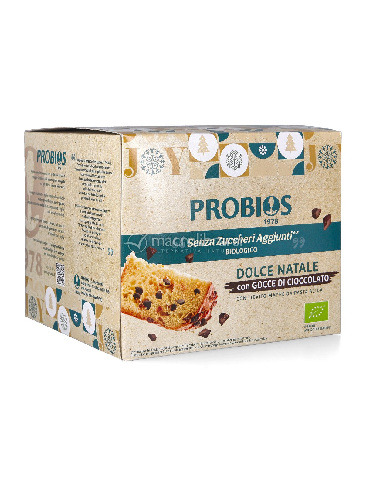 Il Dolce di Natale Probios con Gocce di Cioccolato senza zuccheri aggiunti, contiene eritrolo biologico, una sostanza naturale estratta dal mais con un processo di fermentazione, simile a quello della maturazione della frutta.