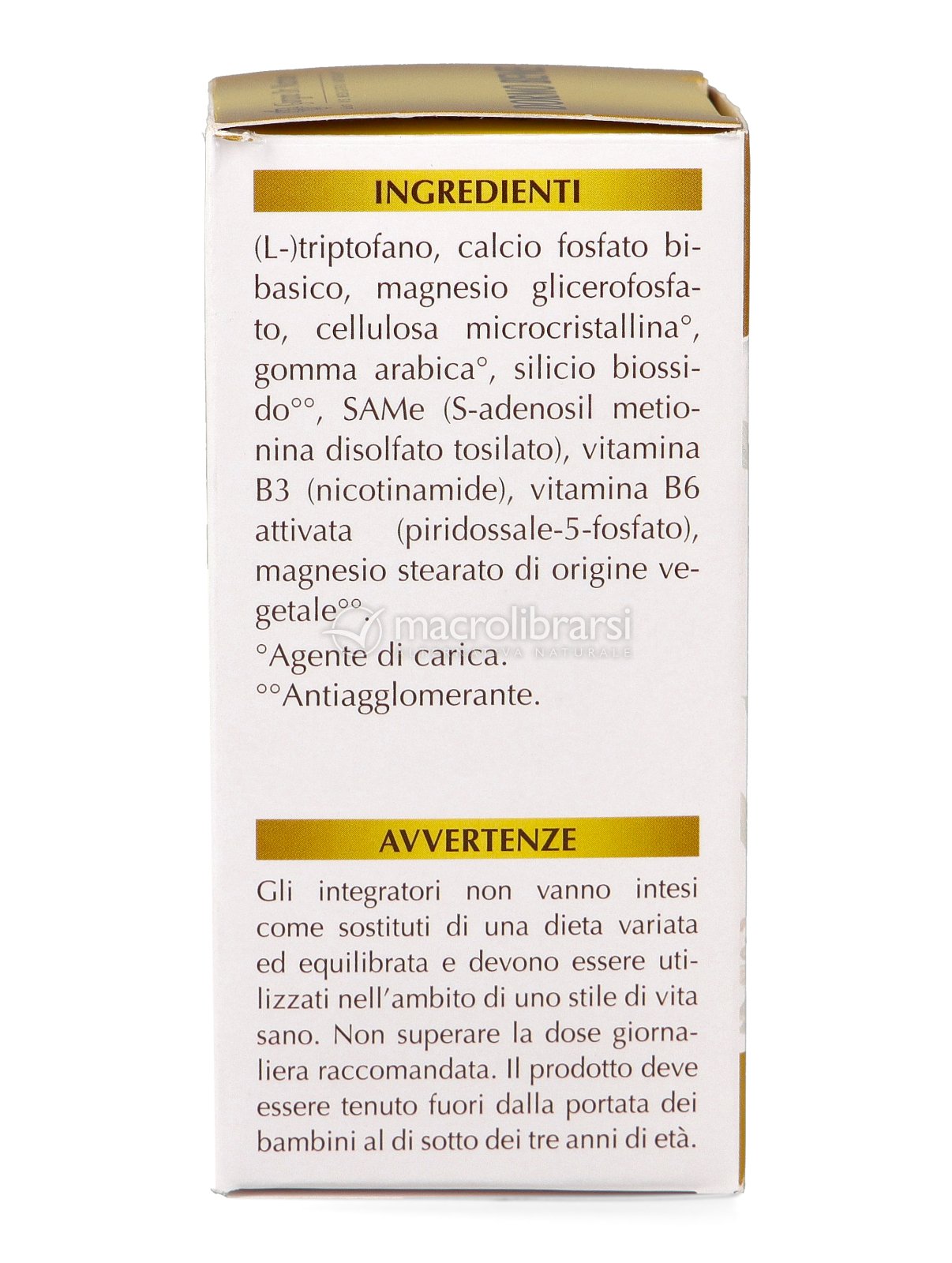 L-triptofano, calcio fosfato bibasico, magnesio glicerofosfato, cellulosa microcristallina*, gomma arabica*, gelatina alimentare**, silicio biossido**, SAMe (S-adenosil metionina disolfato tosilato), vitamina B3 (nicotinamide), vitamina B6 (piridossina cloridrato), magnesio stearato di origine vegetale**. *Agente di carica. **Antiagglomerante.