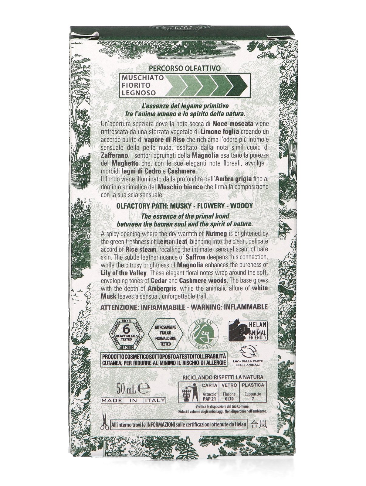 L’apertura speziata della Noce moscata incontra la vitalità verde della foglia di Limone, creando un accordo limpido e avvolgente che ricorda il profumo pulito della pelle nuda. La Magnolia illumina la composizione con note agrumate e delicate, esaltando la purezza del Mughetto, mentre una carezza di Zafferano aggiunge un tocco caldo e leggermente cuoiato.