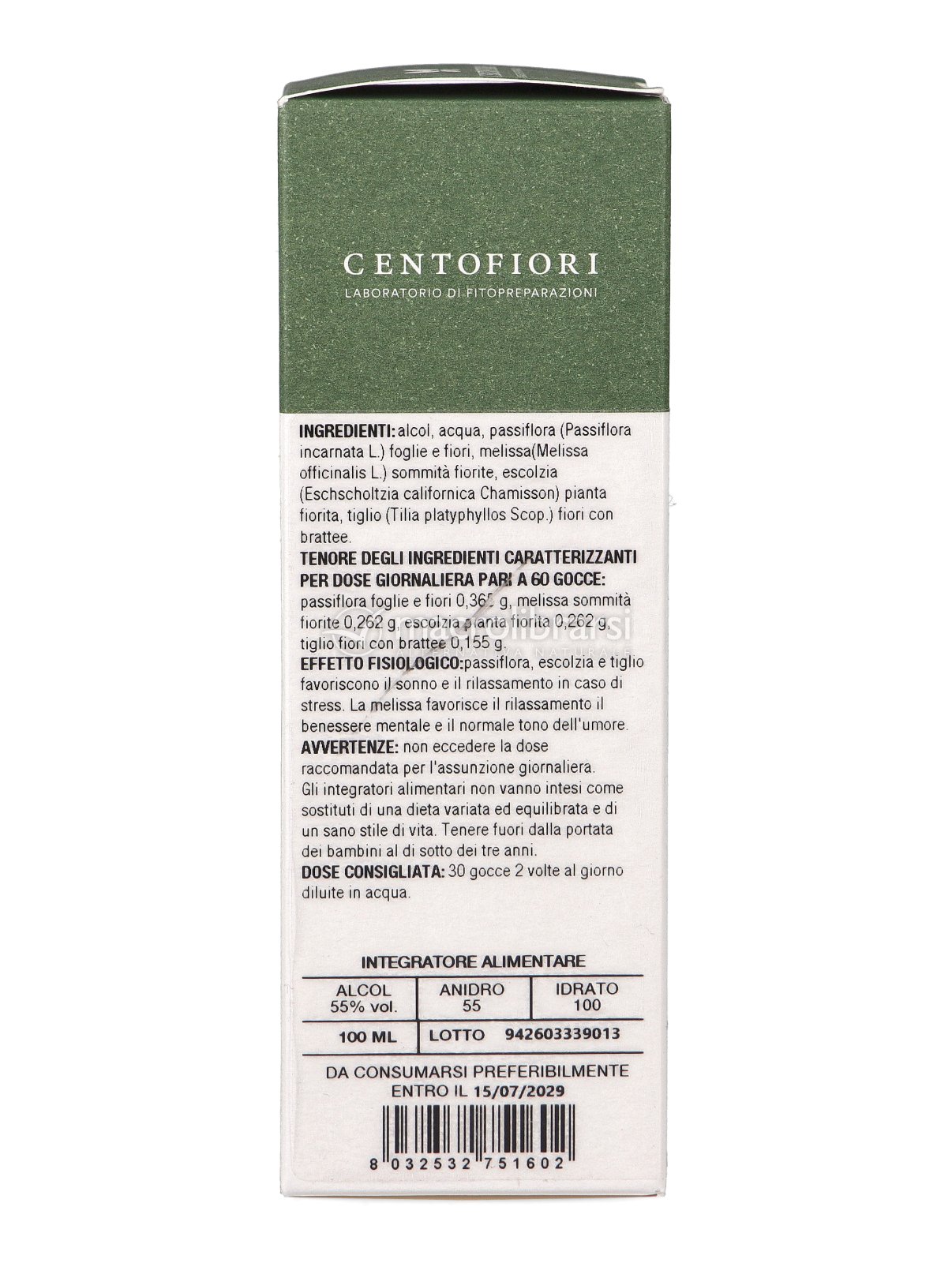 Ecosed di Centofiori contiene una sinergia di piante fresche macerate simultaneamente, formulata per offrire un supporto completo al sistema nervoso, agendo sia sulla componente ansiosa che sulla difficoltà di addormentamento. Contiene: