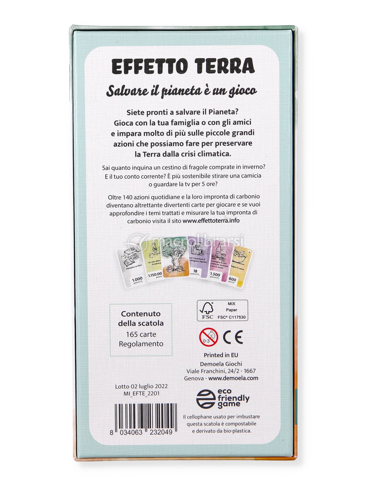 | Note | Cristian Confalonieri - Autore/ I dati riportati sulle carte di Effetto Terra si basano su fonti affidabili e ricerche riconosciute a livello internazionale. Tra i riferimenti principali ci sono il libro La tua impronta di Mike Berners-Lee (Terre di Mezzo Editore) e la sua edizione aggiornata del 2020, How Bad Are Bananas? (Profile Books Ltd.), testi di riferimento per la divulgazione sull’impatto ambientale delle attività quotidiane. Un contributo fondamentale è arrivato anche da Banca Etica, che ha creduto fin da subito nel valore di Effetto Terra come strumento educativo per la sostenibilità. Unica nel panorama bancario italiano, Banca Etica finanzia esclusivamente progetti che generano benefici per la collettività, sostenendo cooperazione sociale e internazionale, tutela dell’ambiente, promozione culturale, energie rinnovabili e agricoltura biologica. Il gioco è stato realizzato in collaborazione con Studiolabo e rappresenta per Demoela un primo passo concreto verso una produzione sempre più attenta all’ambiente e orientata alla sostenibilità. |