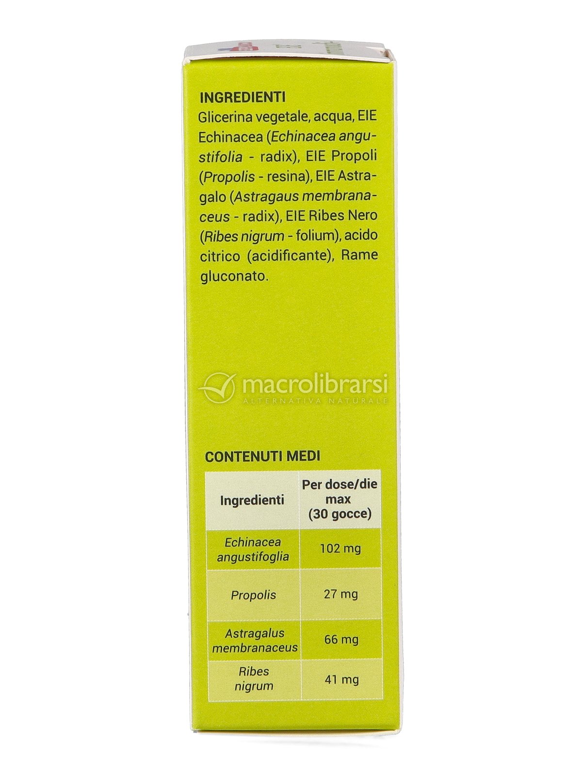 Glicerina vegetale, acqua, Echinacea (Echinacea angustifolia - radix) Propoli (Propolis - resina), Astragalo (Astragaus membrana-ceus-radix) Ribes Nero (Ribes nigrum-folium), acido citrico (acidificante), Rame gluconato.