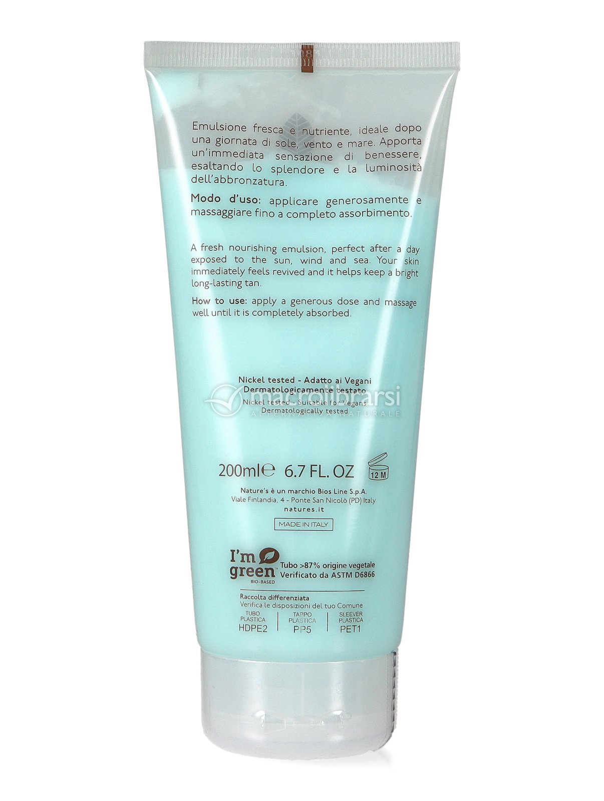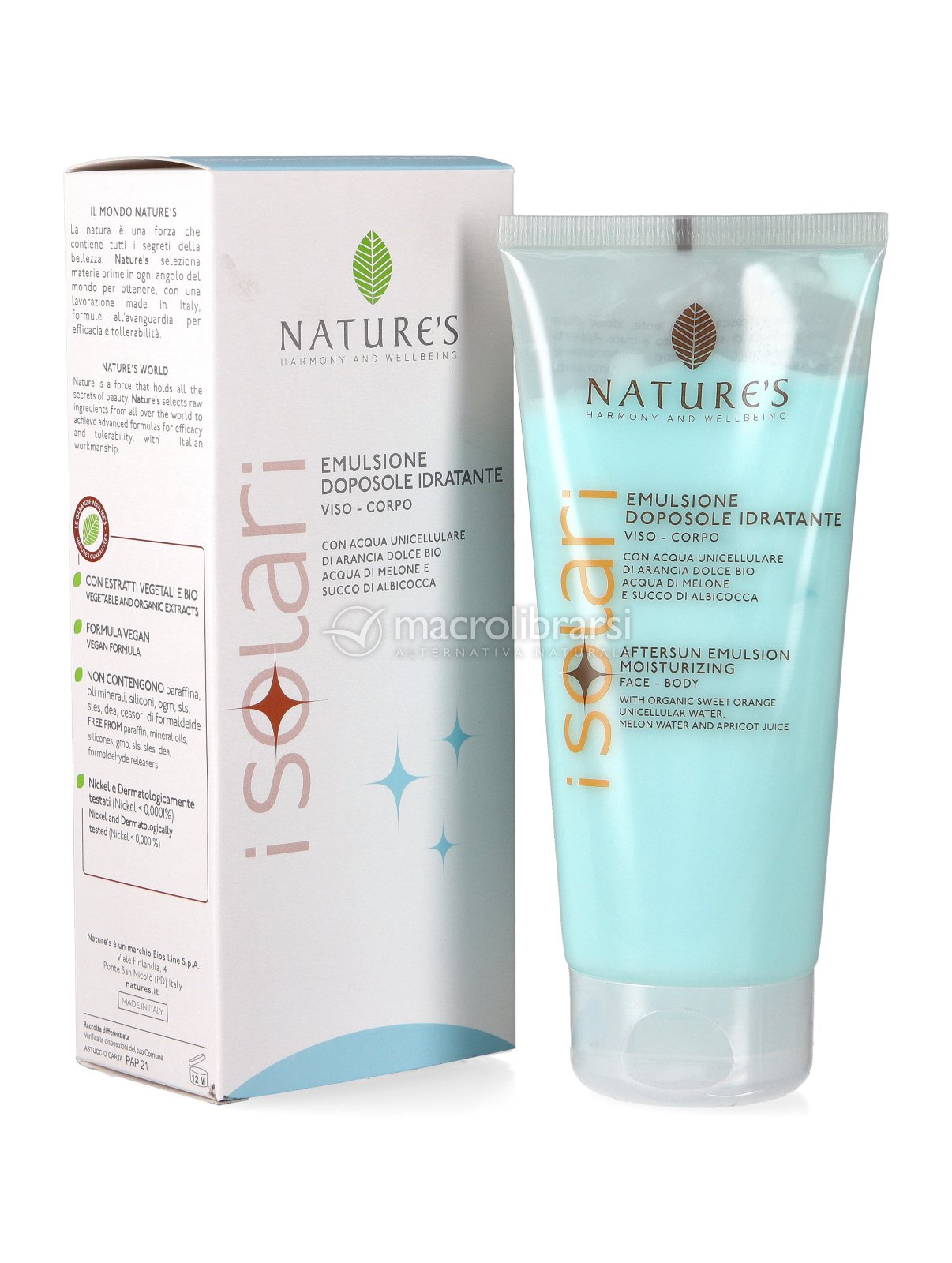 Arricchita da Acqua Unicellulare bio-attiva di Arancia Dolce*, acqua di Melone idratante e Latte di Albicocca, nutriente e lenitivo, l'Emulsione Idratante Doposole Viso e Corpo di Nature's dona alla pelle un aspetto morbido e vellutato, esaltando lo splendore e la luminosità dell'abbronzatura.