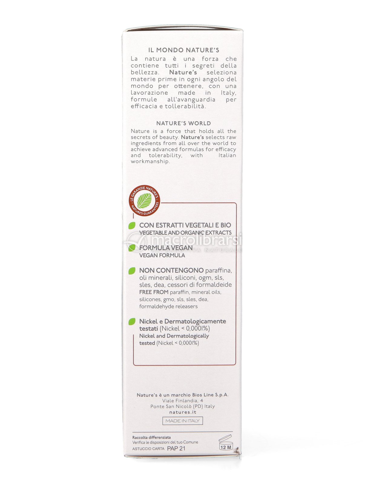 | Disclaimer | I dati riportati sulla confezione del prodotto (INCI, consigli di utilizzo, data di scadenza, certificazioni, etc) possono variare sulla base dell'aggiornamento delle formulazioni da parte dei produttori, dell'arrivo di un nuovo lotto e dell'adeguamento alle norme di legge. Vi preghiamo pertanto di fare sempre riferimento alle informazioni presenti in etichetta prima di utilizzare il prodotto acquistato. Le immagini riportate hanno uno scopo puramente indicativo e sono soggette a variazioni da parte dei produttori. |