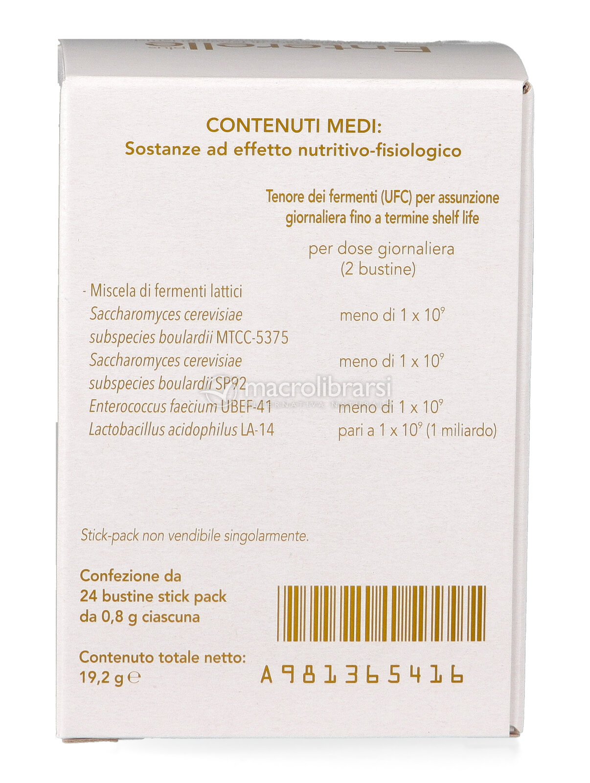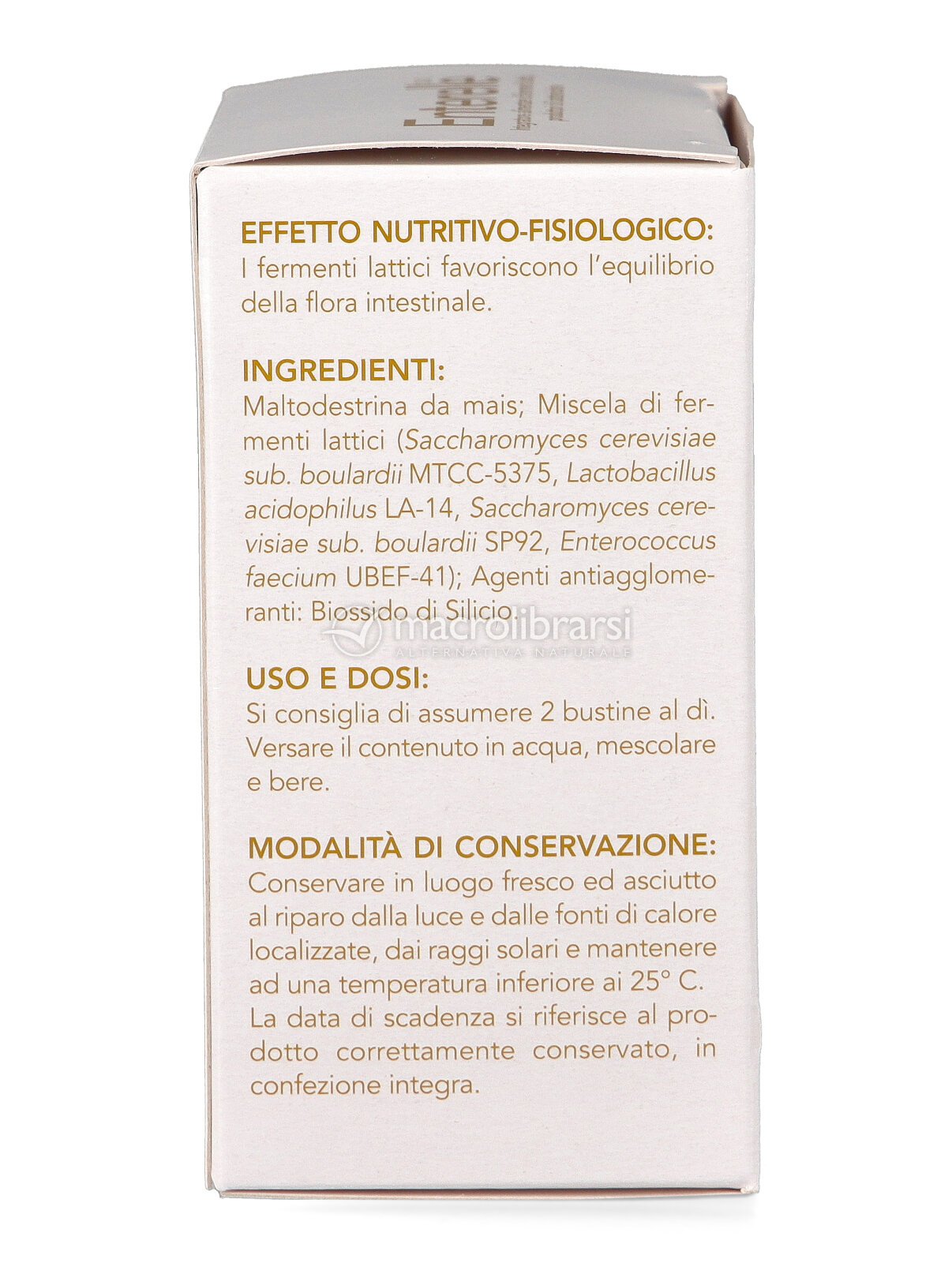 Maltodestrina da mais, miscela di fermenti lattici (Saccharomyces cerevisiae sub. boulardii MTCC-5375, Lactobacillus acidophilus LA-14, Saccharomyces cerevisiae sub. boulardii SP92, Enterococcus faecium UBEF-41); agenti antiagglomeranti: biossido di silicio.