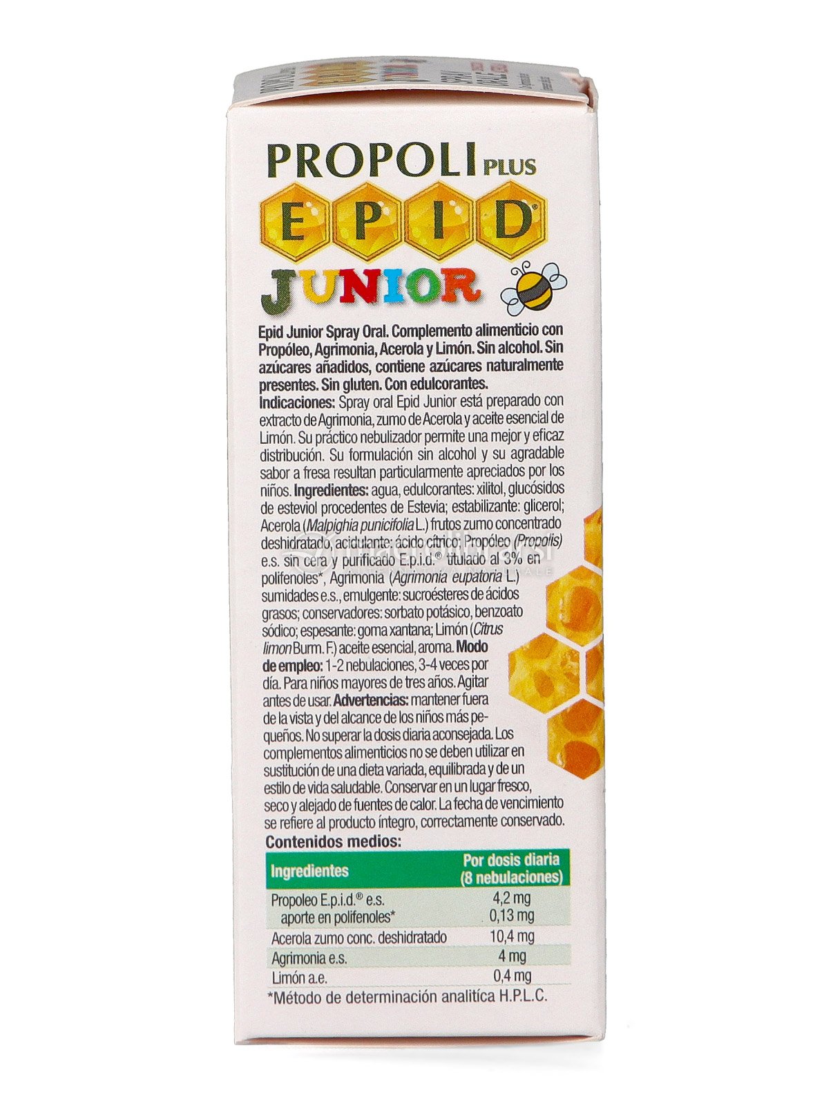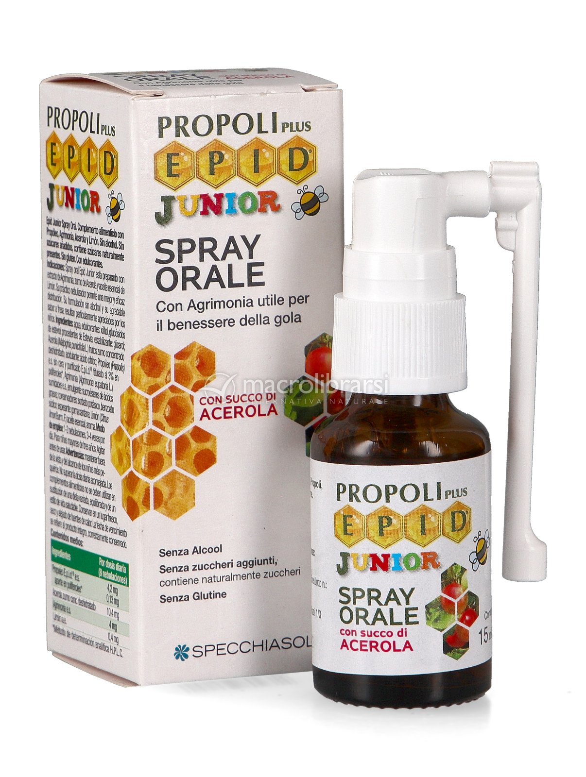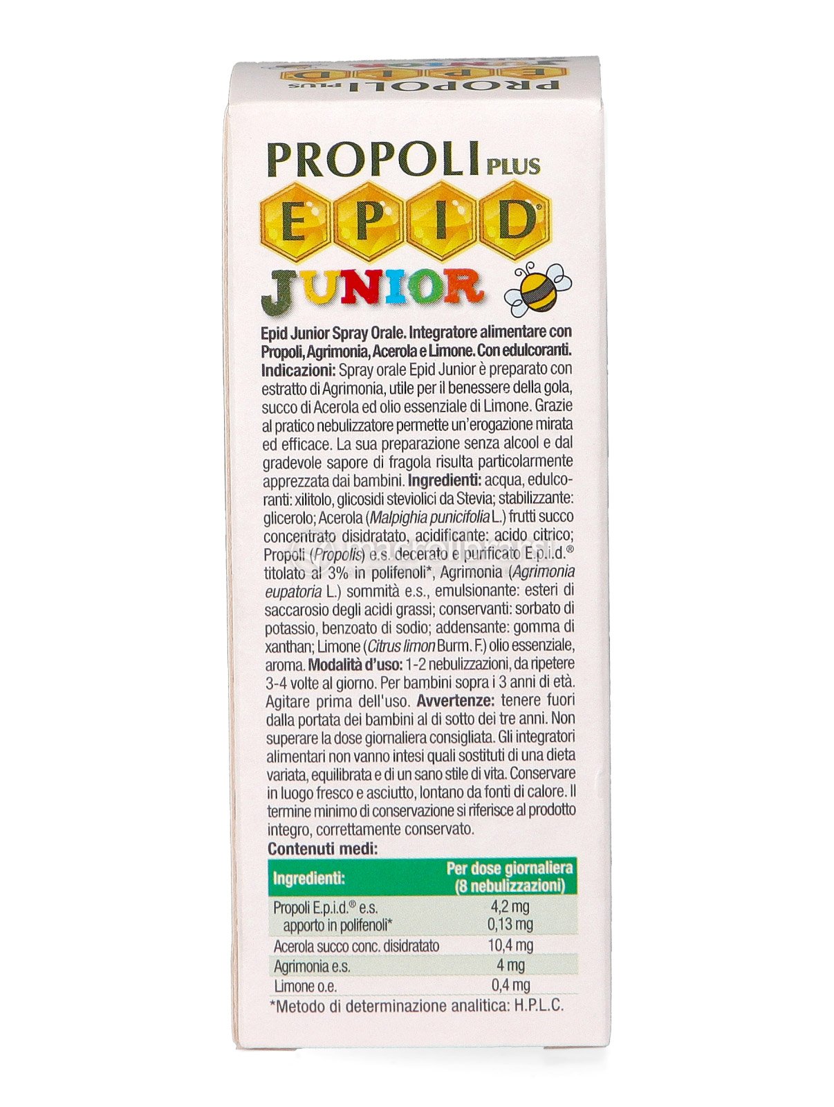 Epid Spray Orale Propoli Plus Junior è un integratore alimentare a base di propoli decerata e purificata E.P.I.D., con estratti di agrimonia, succo di acerola e olio essenziale di limone, pensato per favorire il benessere della gola dei bambini.