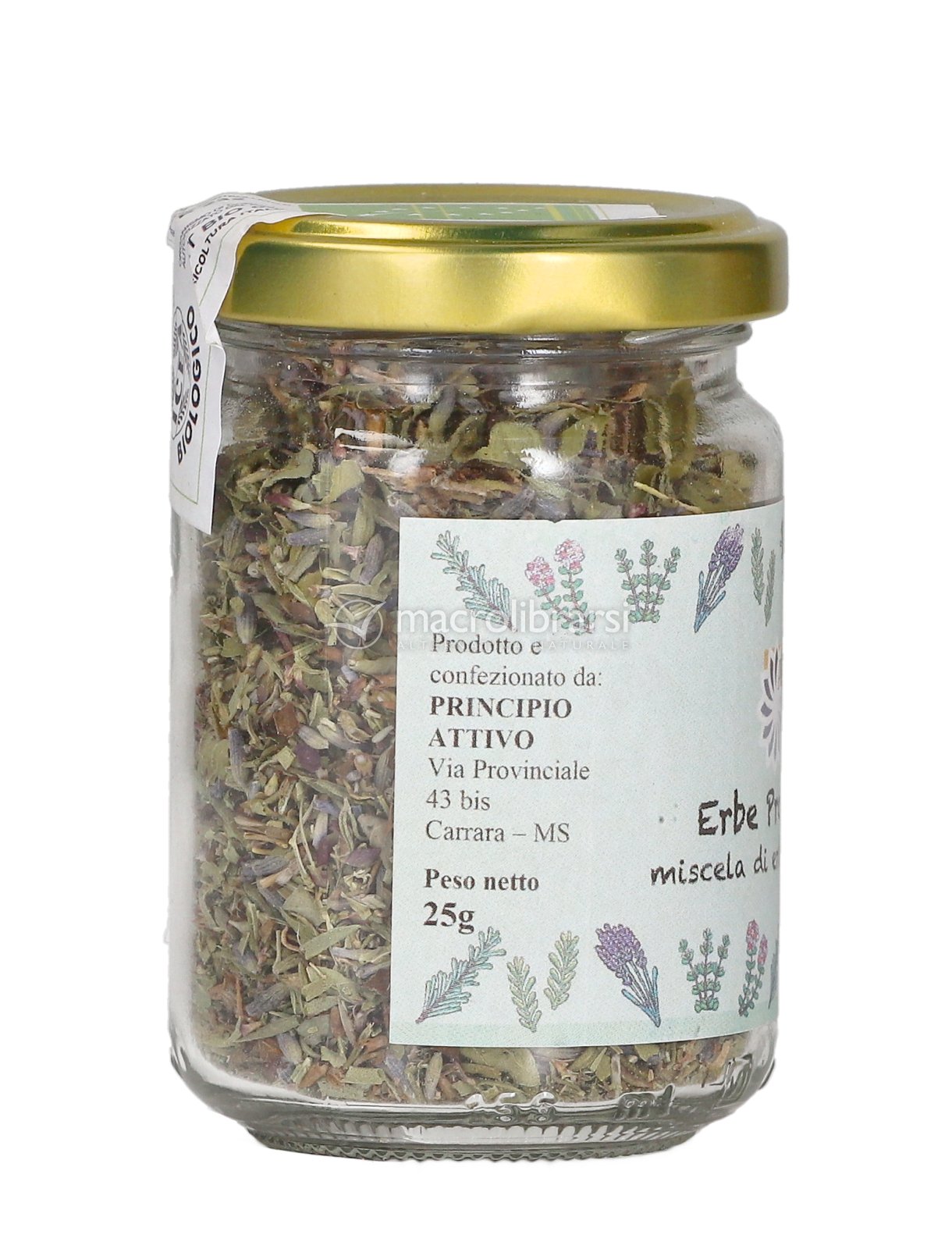 La linea di prodotti alimentari Principio Attivo comprende profumate miscele di erbe aromatiche, preparate solo con erbe coltivate nei nostri campi a La Perla, tra le Alpi Apuane ed il mare, senza aggiunta di sale.