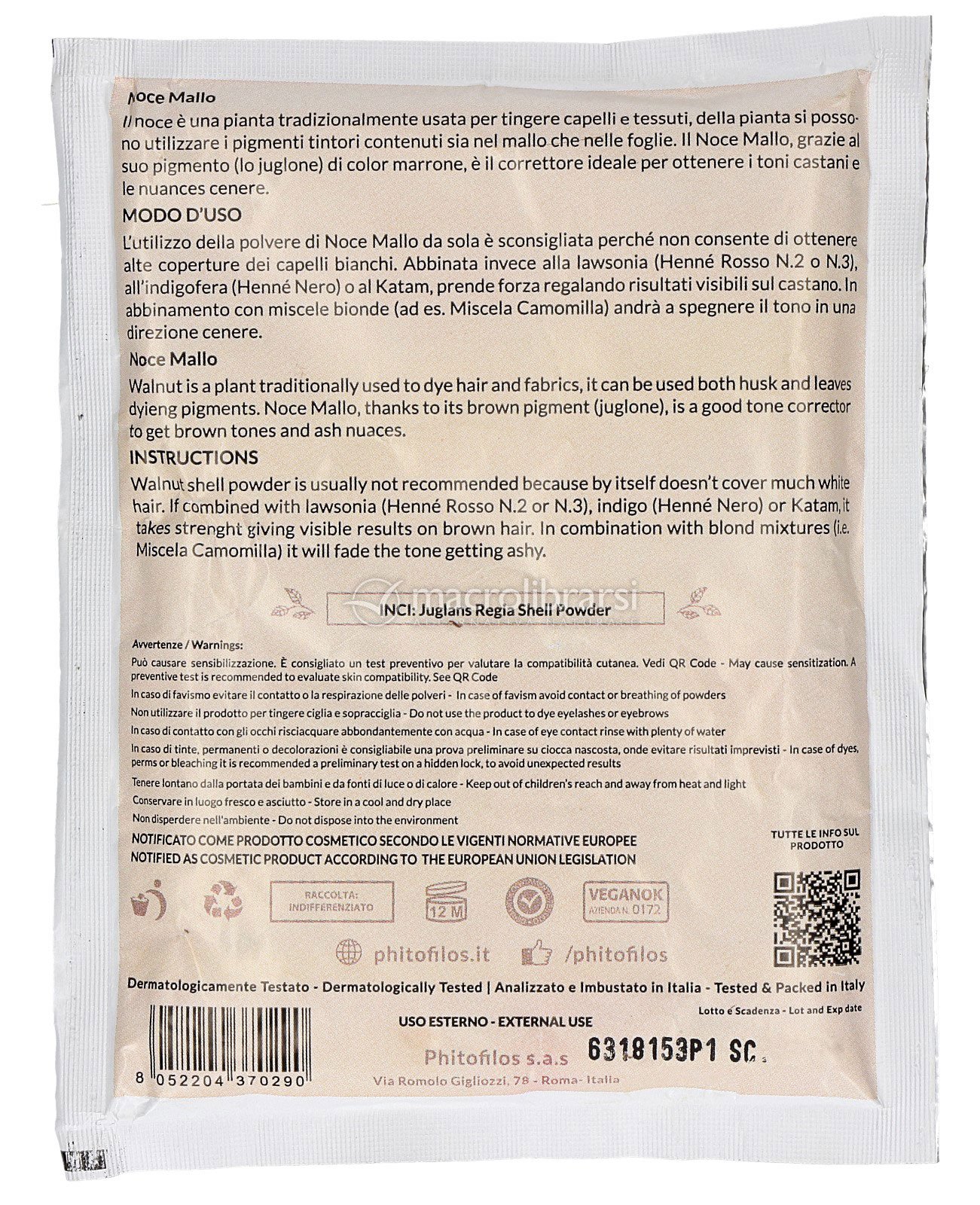 Polvere pura di Mallo di Noce (Juglans Regia), ottenuta dalla polverizzazione di solo mallo.