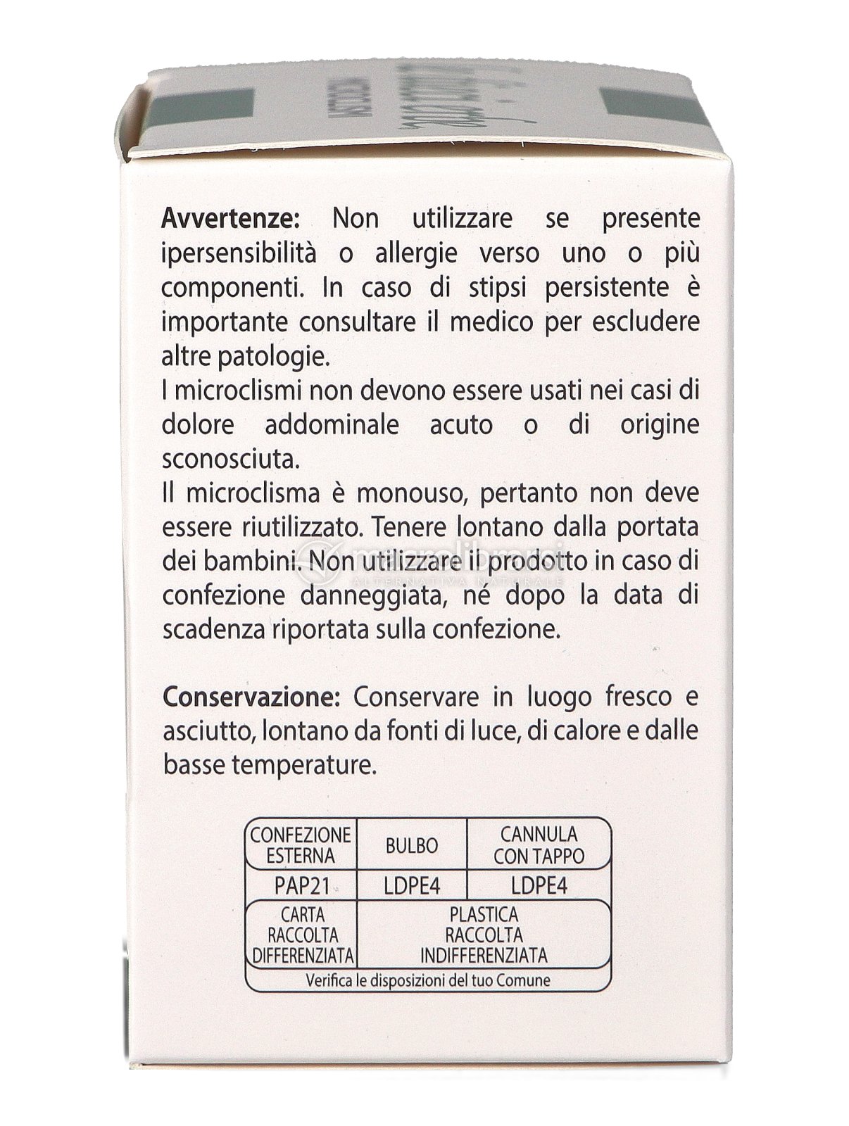 Note | Non utilizzare se presente ipersensibilità o allergie verso uno o più componenti. In caso di stipsi persistente è importante consultare il medico per escludere altre patologie. I microclismi non devono essere usati nei casi di dolore addominale acuto o di origine sconosciuta. Il microclisma è monouso, pertanto non deve essere riutilizzato. Tenere lontano dalla portata dei bambini. Non utilizzare il prodotto in caso di confezione danneggiata, né dopo la data di scadenza riportata sulla confezione. |